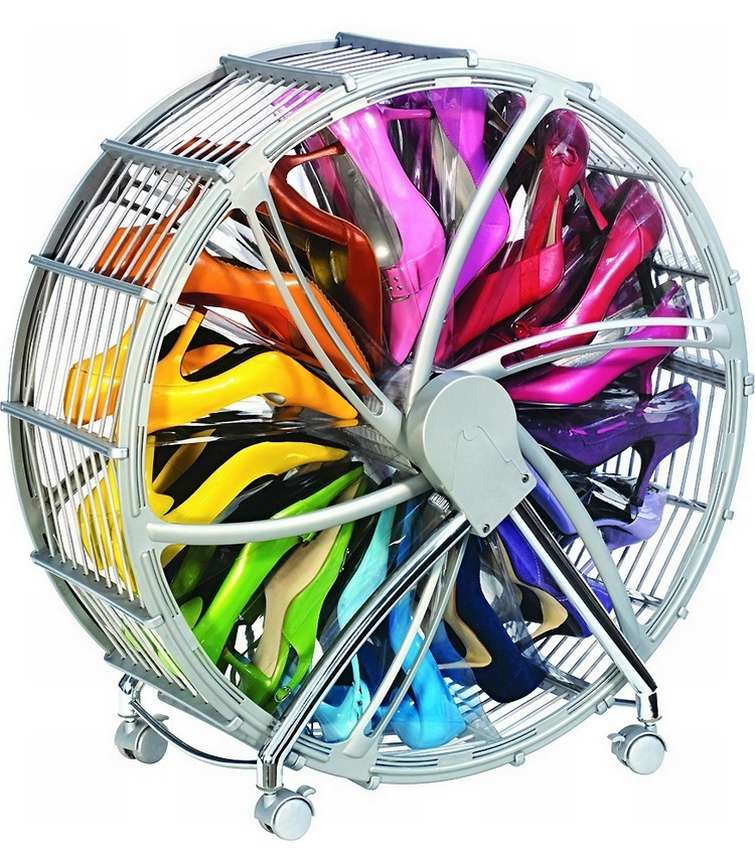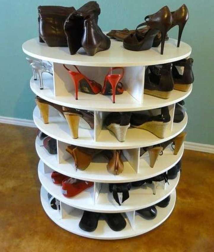 هذا الخيار مناسب للتركيب في الرواق ، ووضعه في الخزانة. يتيح لك الرف المستدير مع الخلايا الفسيحة العثور بسرعة على زوج الأحذية المناسب - تحتاج فقط إلى تدويره حول محورها. يمكن صنع هذا الرف من الخشب ، اللوح ، قضيب من البلاستيك والمعدن.