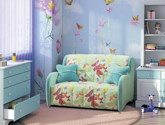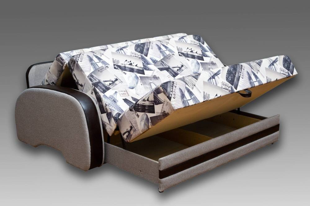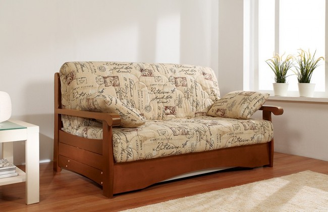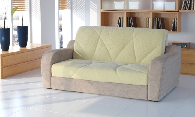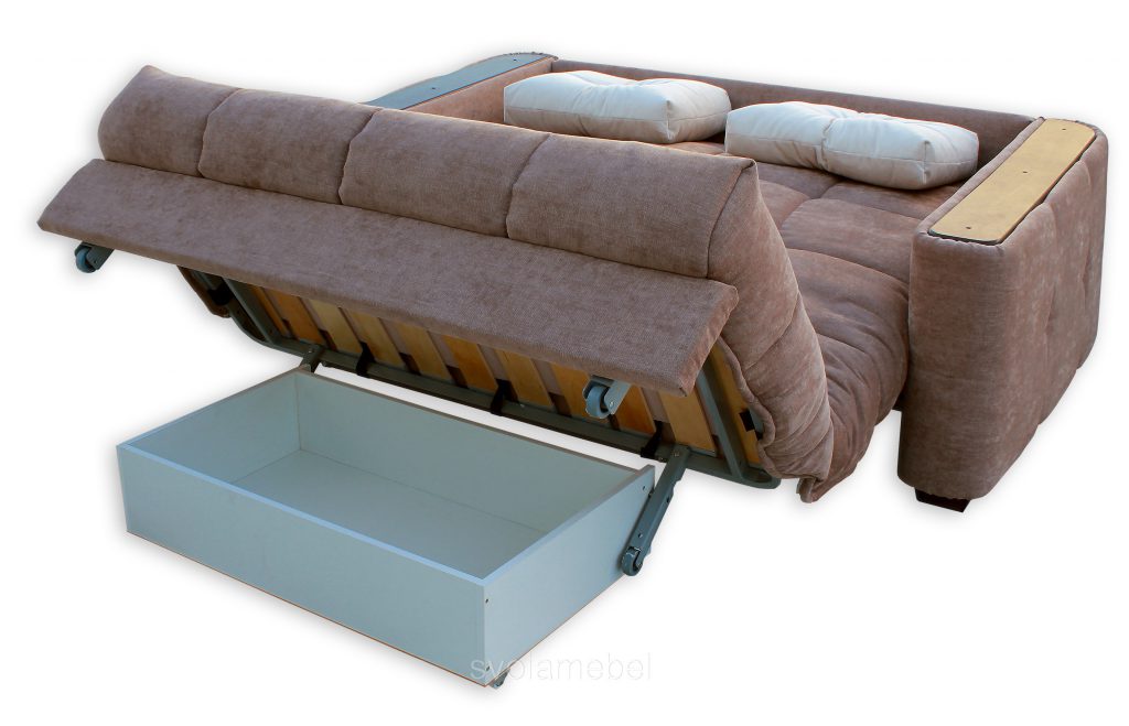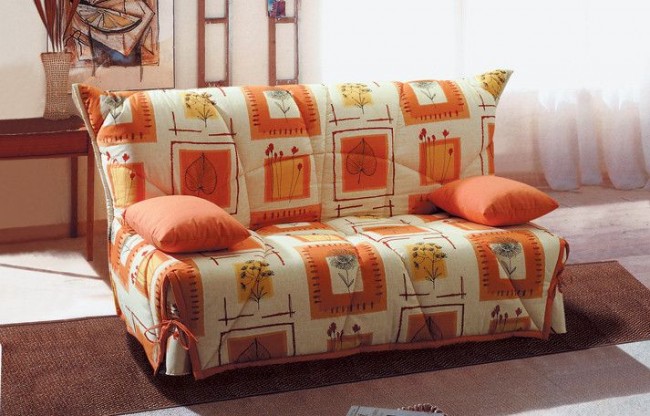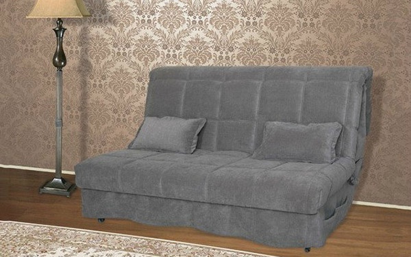 في الحالة المجمعة ، هذه أريكة عادية. يمكن أن تكون مستقيمة أو زاوية ، مع أو بدون مساند للذراعين.