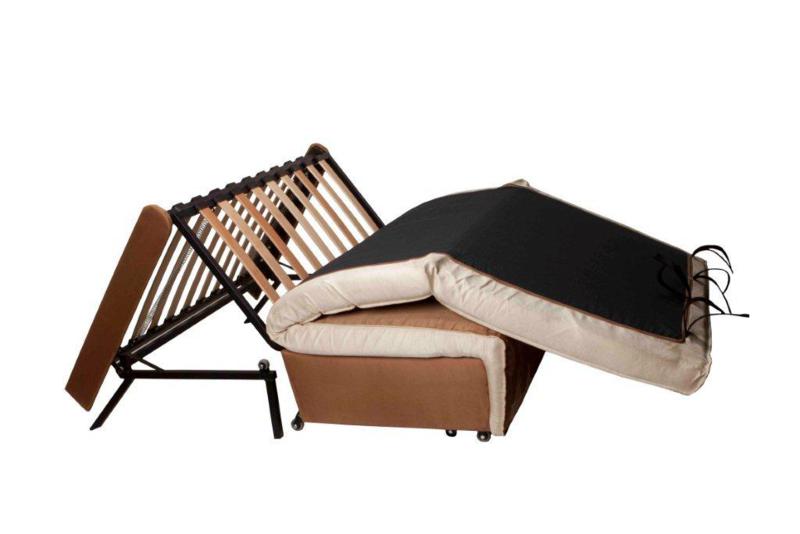 آلية التحويل إلى السرير بسيطة: يتم رفع الجزء السفلي القابل للسحب على العجلات قليلاً ، وبعد النقر ، يتم سحبها باتجاه نفسها حتى يتم محاذاتها تمامًا مع الرصيف. من السهل أيضًا التحويل إلى الأريكة "الأكورديون" - يتم رفع المقعد ويتراجع إلى موضعه الأصلي.