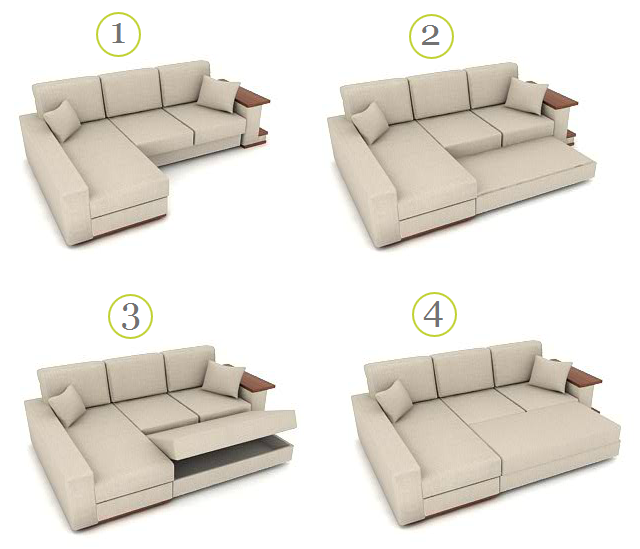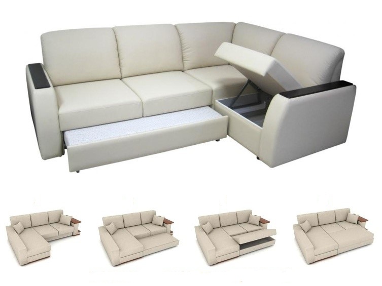 تتميز الأريكة بميزة بناءة ملحوظة لآلية التحول ، قادرة على تحمل التحولات اليومية إلى سرير مزدوج وظهر لسنوات عديدة دون أعطال. في بعض الأحيان هناك طرز ذات رصيف متباعد بشكل غير متساو ، لكنها أكثر مقاومة للتحولات العادية ولديها مقاعد مريحة للغاية. تجدر الإشارة إلى أن الأرائك الزاوية مصممة لغرف المعيشة الفسيحة ، ولكن يمكنك شراء طرازات مناسبة للغرف الصغيرة ، في حين أنها ستزين أي ديكورات داخلية وتحتوي على أدراج بياضات مدمجة.