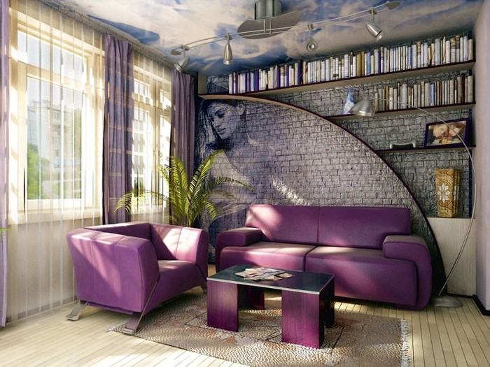 - بساطتها. التأكيد على أن الإبداع في هذا التصميم الداخلي يمكن أن يستخدم أشكالًا بسيطة من الأريكة الأرجواني. ضعه بجانب جدار أبيض ينصب لإضافة أناقة الغرفة. سوف تصبح مجموعة مكتفية ذاتيا. تفاهات الزخرفية إضافية ليست مطلوبة. بساطتها وتتميز بعدم وجود تفاصيل كثيرة.