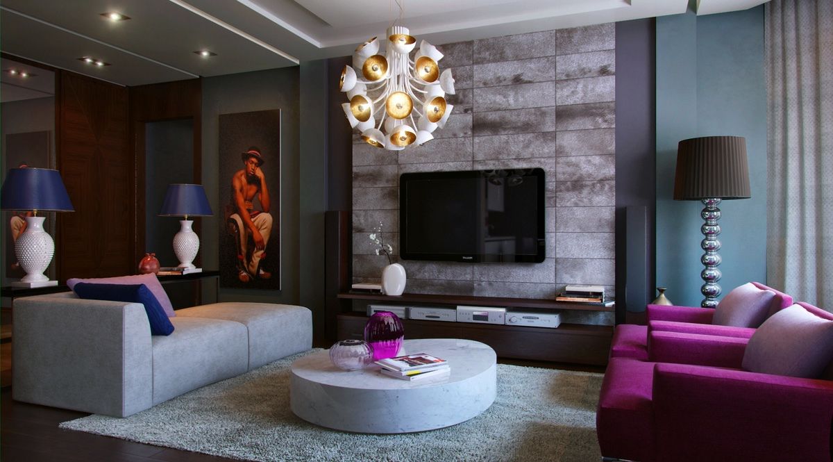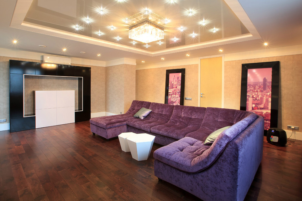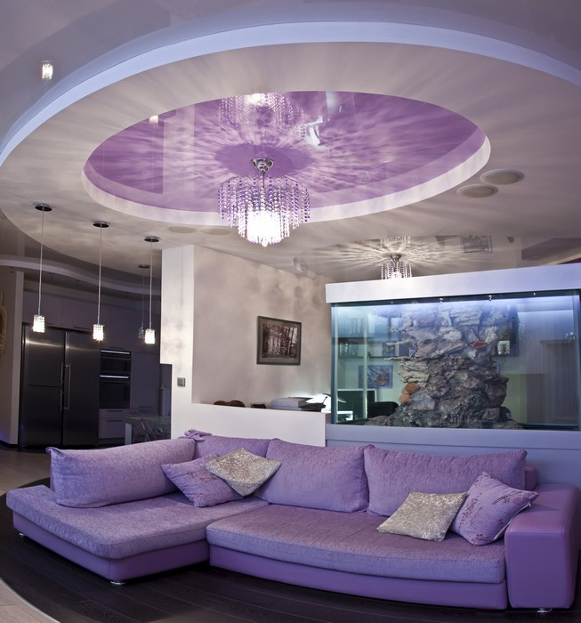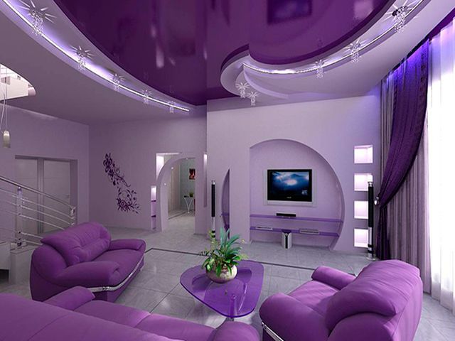 غرفة معيشة لطيفة أرجواني أرجواني مع إضاءة غير عادية من الرفوف والسقف