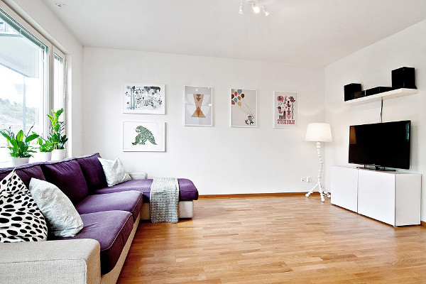 - الأبيض. احصل على تباين قوي في الألوان. مزيج لا يبدو مزعج ، وسيتم النظر بشكل طبيعي ، بشكل طبيعي. إذا كنت لا ترغب في وضع الأريكة بألوان سوداء أو زرقاء ، فإن اللون الأرجواني سيكون حلاً جيدًا.