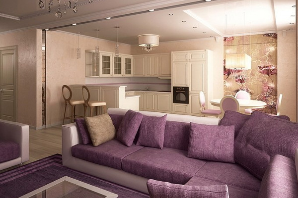 أريكة أرجوانية كبيرة في غرفة المعيشة المشتركة المطبخ