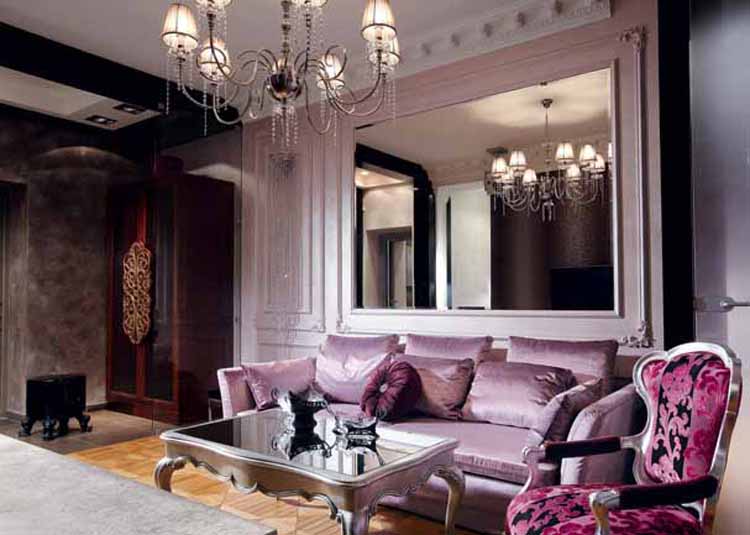 - الكلاسيكية. إضافة جو من الفخامة والرقي سيساعد على ربط الأريكة مع زخرفة الجدران بلون البيج وإضافة ستائر لافندر على فتحات النوافذ. إنشاء الداخلية مماثلة ، يمكنك اختيار أريكة مع المفروشات المخملية. قد تكون العناصر الزخرفية الرائعة موجودة. ستضفي المفروشات الناعمة نعومة على النغمات الباردة الموجودة في الغرفة. سطح لامع سيعزز الانطباع. يمكن تخفيفه بمساعدة تفاصيل الديكور الخاصة والإضاءة.