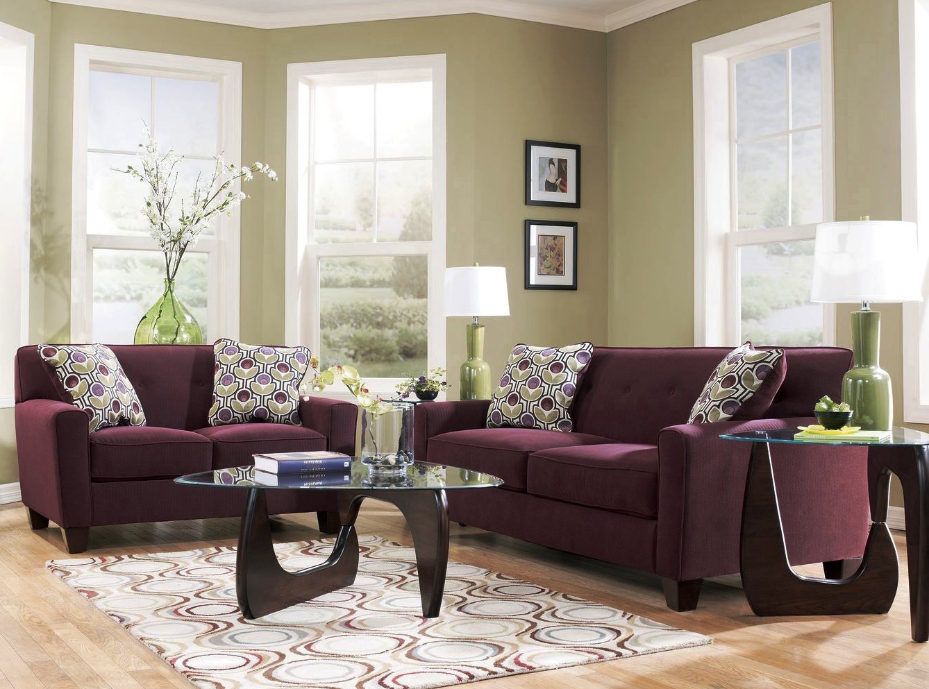 الانسجام والراحة في غرفة المعيشة مع أريكة أرجوانية وعناصر بورجوندي