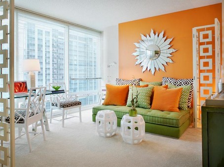 أريكة رمادية محايدة في غرفة برتقالية دافئة