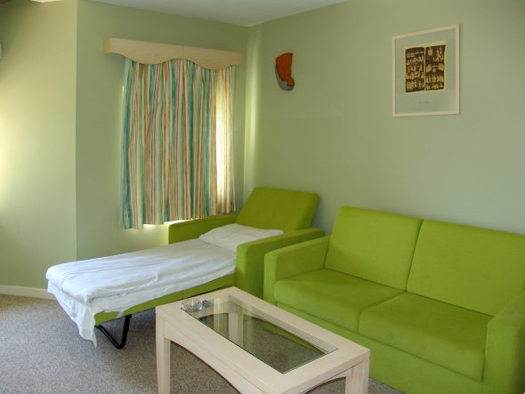 يحتوي تصميم الضيف على سرير أريكة كبير ، مجهز بآلية "سرير قابل للطي فرنسي".سيكون مفيدًا إذا كنت لن تقوم بتفكيكه وتجميعه في كثير من الأحيان ، لأن هيكله بالكامل مرهق للغاية وغير مريح إلى حد ما في الظهور.