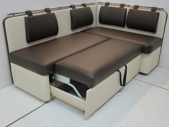 يتم إخفاء السرير الإضافي لهذا التصميم في صندوق منزلق يقع أسفل المقعد.