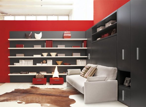 أريكة مع آلية "الأكورديون" — هذه هي قطعة الأثاث الأكثر إحكاما. في شكل تكشفت ، أنها مريحة للغاية. ومع ذلك ، فإن التحول يتطلب مساحة إضافية.