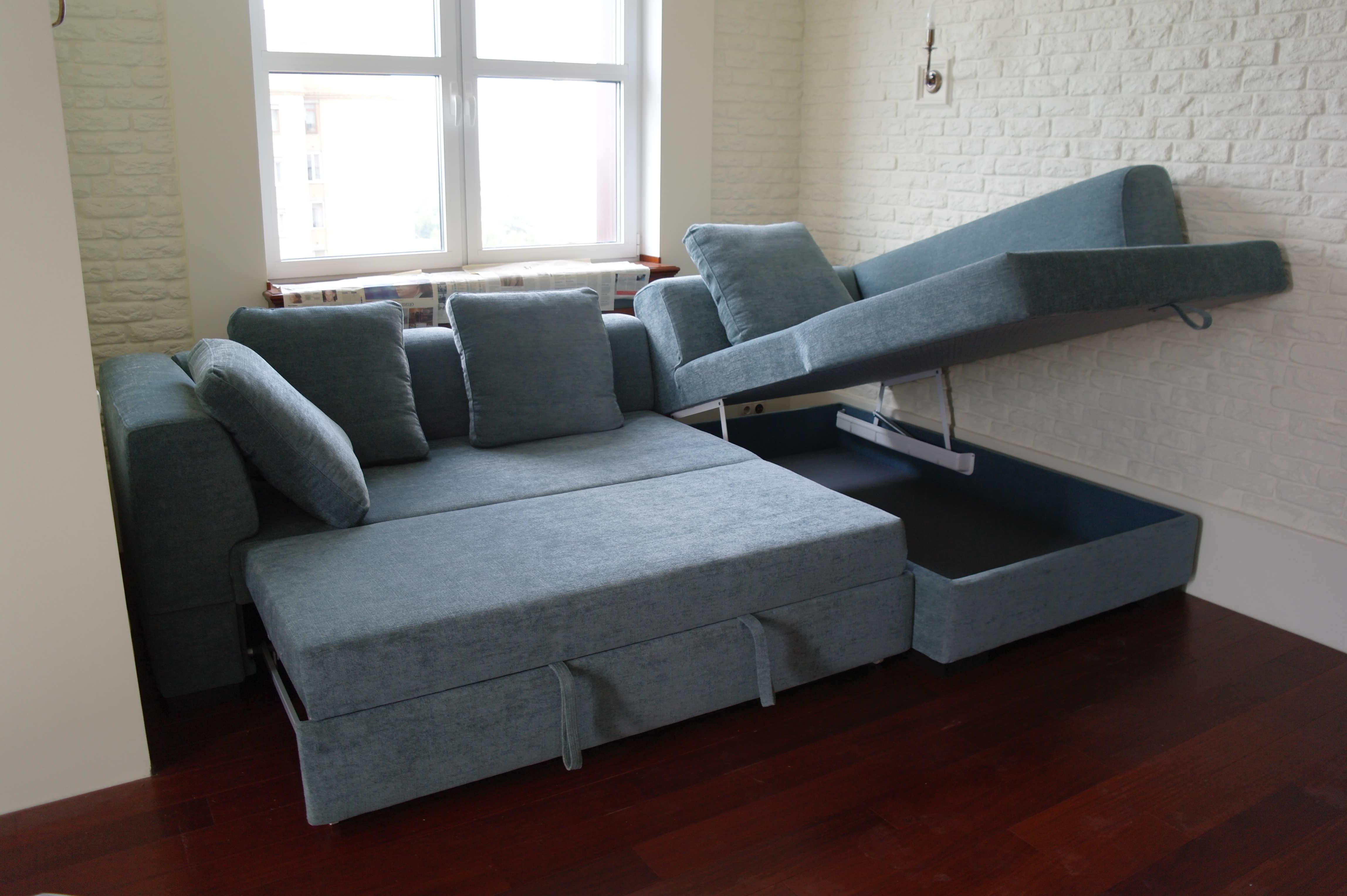 العيوب: يمكنك وضع أريكة بالقرب من الحائط إذا كنت لا تستخدمها كمكان للنوم كل يوم ؛ إذا لم تكن هناك مساحة خالية خلف الأريكة ، فلا يمكنك تحريكها بعيدًا ؛ في المكان الذي يتم فيه توصيل الظهر والمقعد ، هناك احتمال حدوث عثرة أو توقف ، وسيكون من غير المريح النوم على هذه الأريكة ؛ مساحة نوم محدودة.