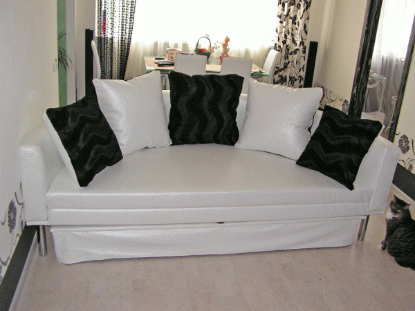 - طور مصنعو الأثاث أريكة صغيرة ذات مظهر جذاب يمكن تحويلها بسهولة إلى مكان للنوم. لن يستسلم لراحة السرير العادية. الميزة هي القدرة على طي وفتح النموذج.