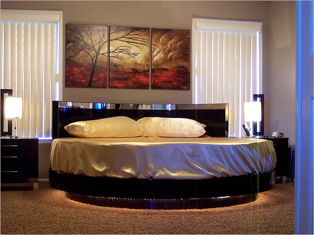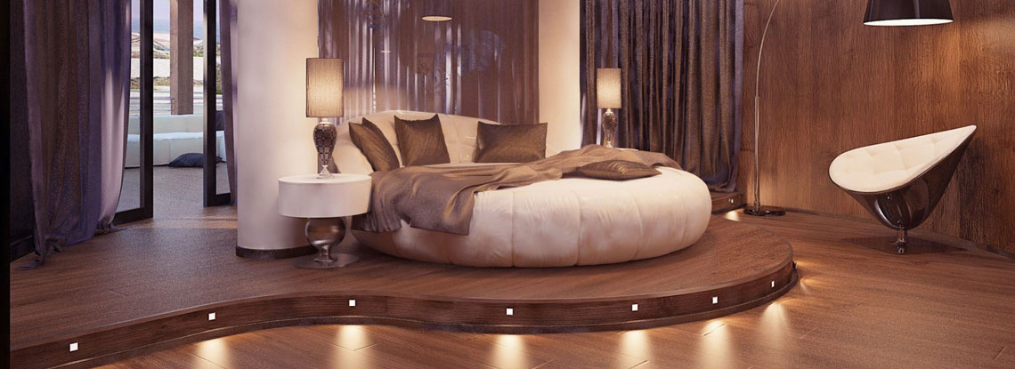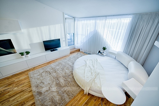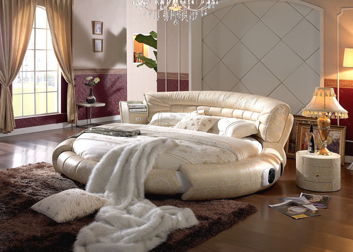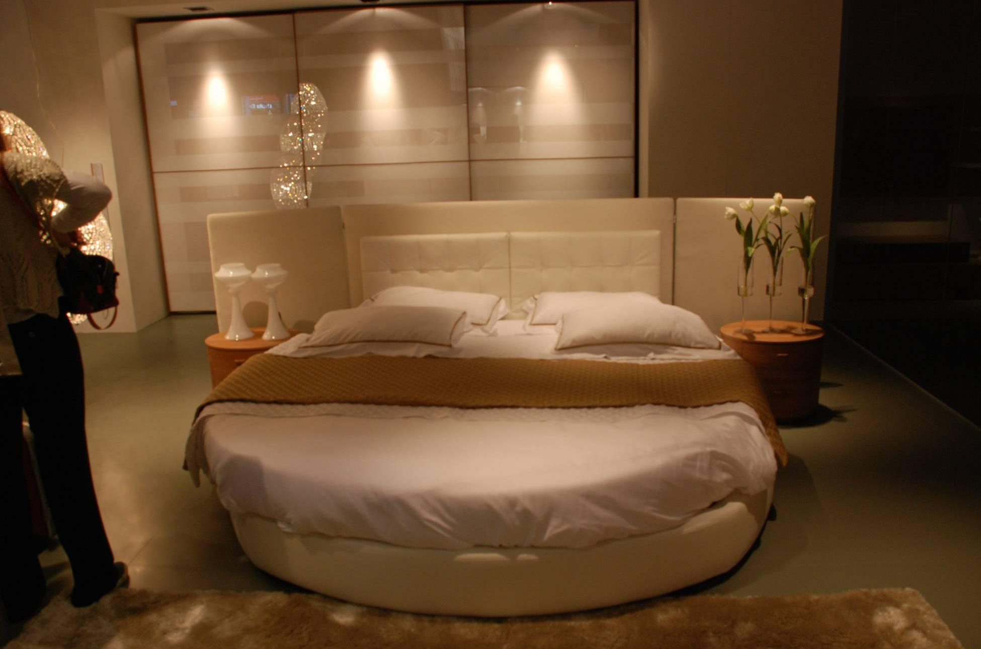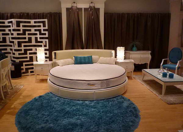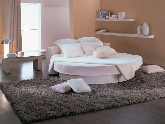 تصميم غرفة نوم حساسة جدا ورومانسية مع سرير دائري غير عادي وطاولات السرير من الشكل المقابل
