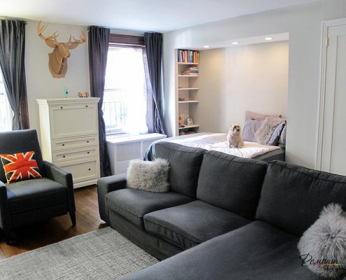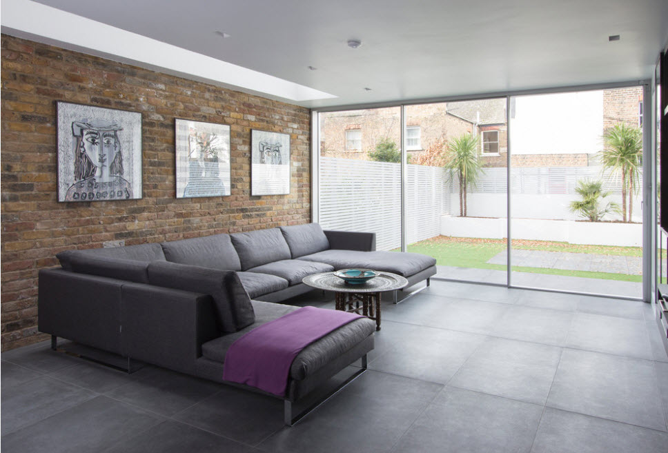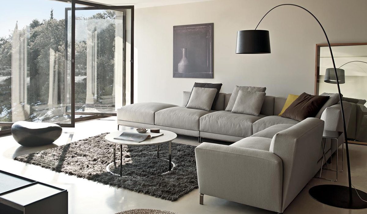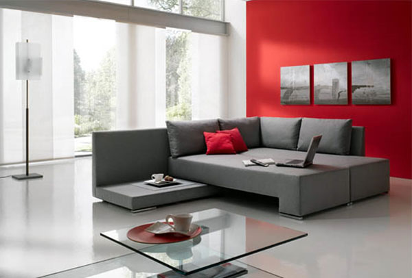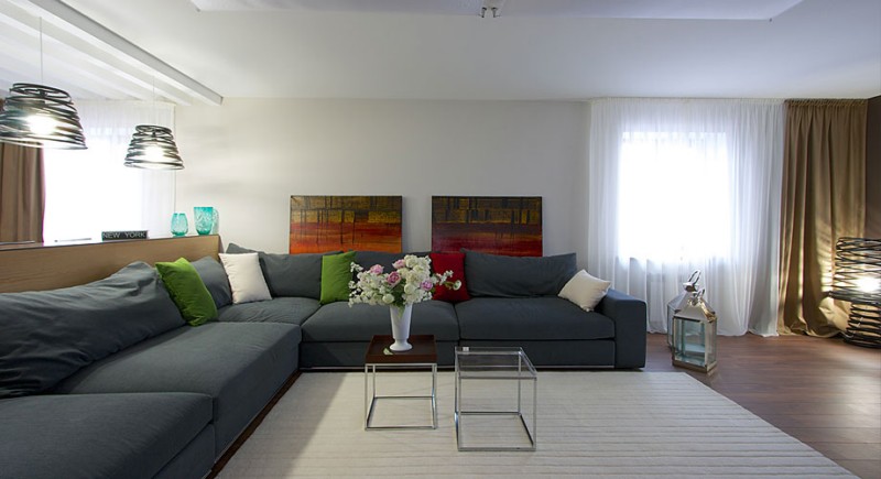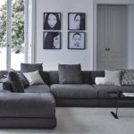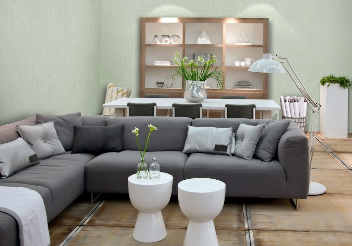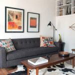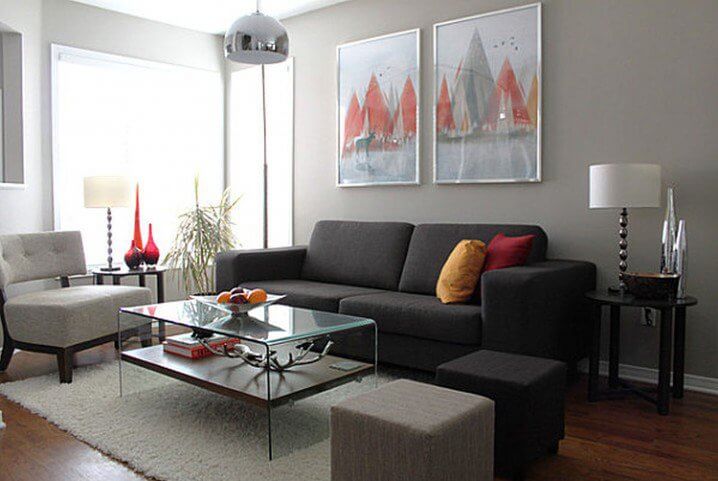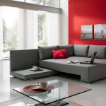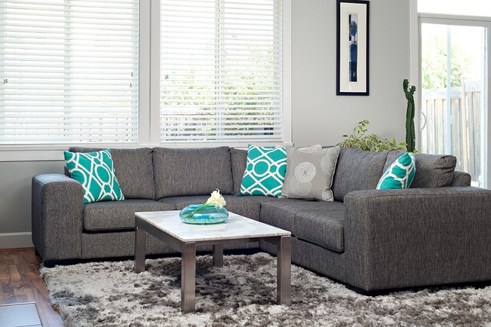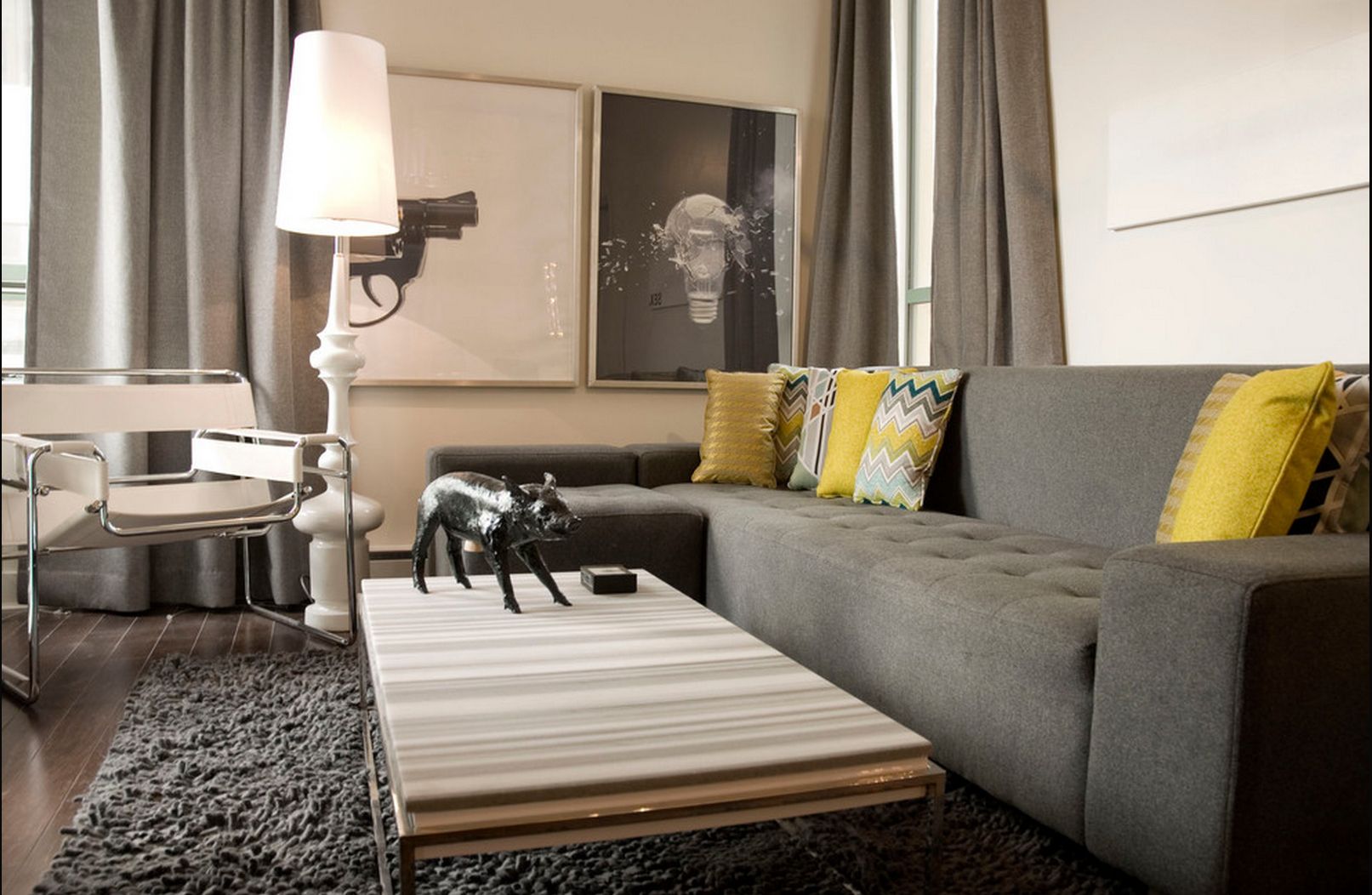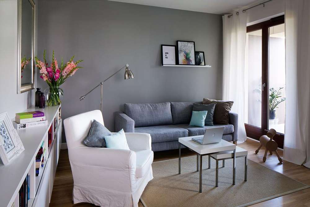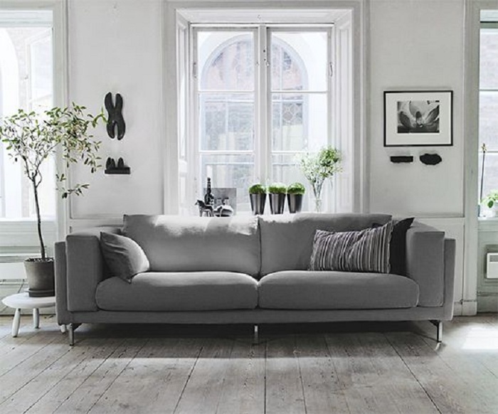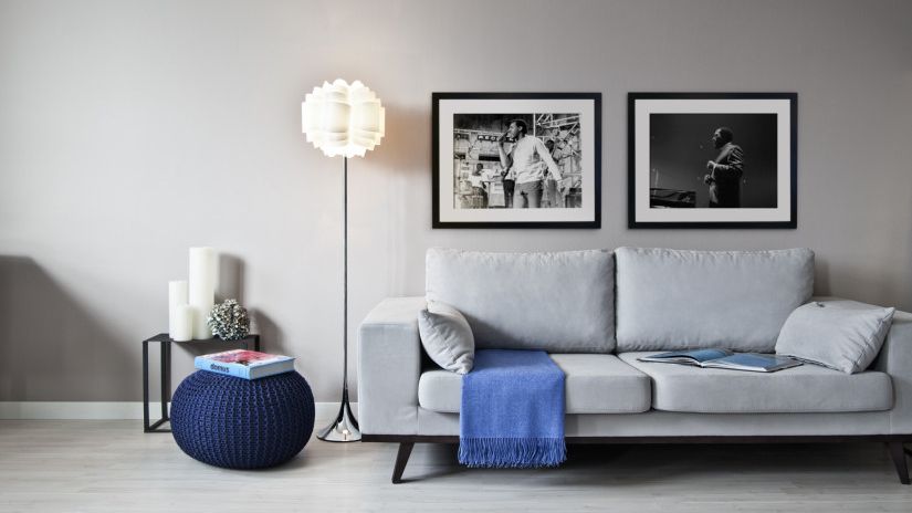 الأريكة الرمادية مثالية لأي نمط ، إلى جانب كل من الضوء والظلام ، والأثاث الملون.