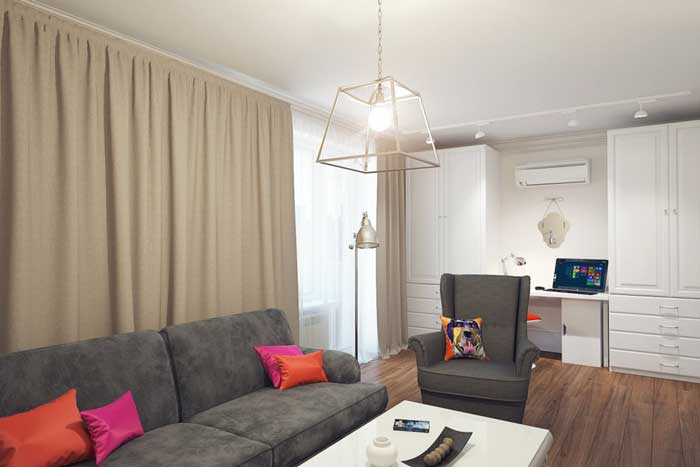 - يجب أن تتناسب الخزانات مع الداخل ، ولا تسدها بأبعادها الضخمة ، وينبغي أن يسعى الأثاث المنجد إلى الحجم الأدنى. هذا يخلق شعورا بالهواء والرحابة. لا تسقط الأريكة الرمادية خارج النطاق العام ولا تؤذي العينين ، لكنها في نفس الوقت تبدو وكأنها بقعة ألوان متناقضة.