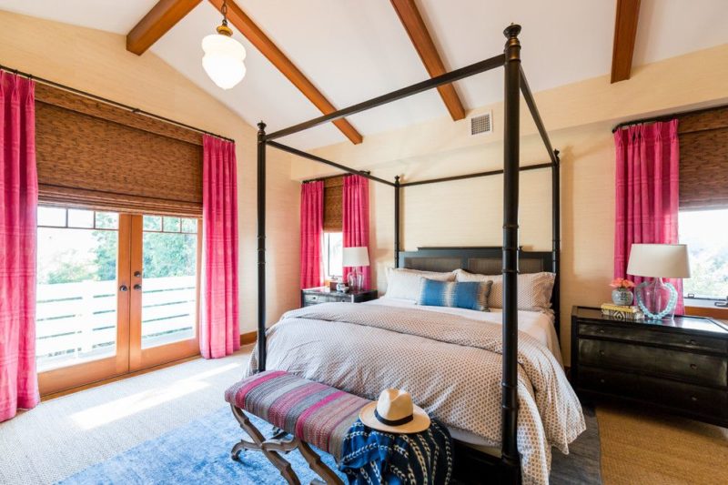 لغرفة النوم ، يوصى باختيار الستائر المصنوعة من الأقمشة الطبيعية: القطن والكتان والحرير والخيزران. إنها خشنة بعض الشيء ، ولكنها تتلاءم تمامًا مع أسلوب البيئة. بالنسبة لغرفة النوم في المنزل ، فإنهم عادة ما يخصصون غرفة صغيرة ، ويضعون كل ما هو ضروري فقط: سرير ، وخزانة ملابس ، ومرآة.
