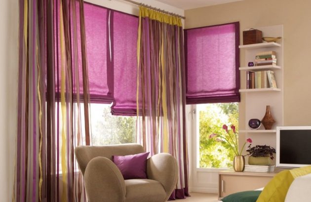 الجمع بين الستائر من مختلف الأنواع والألوان والقوام ، يمكنك الفوز على النافذة بشكل مثير للاهتمام.