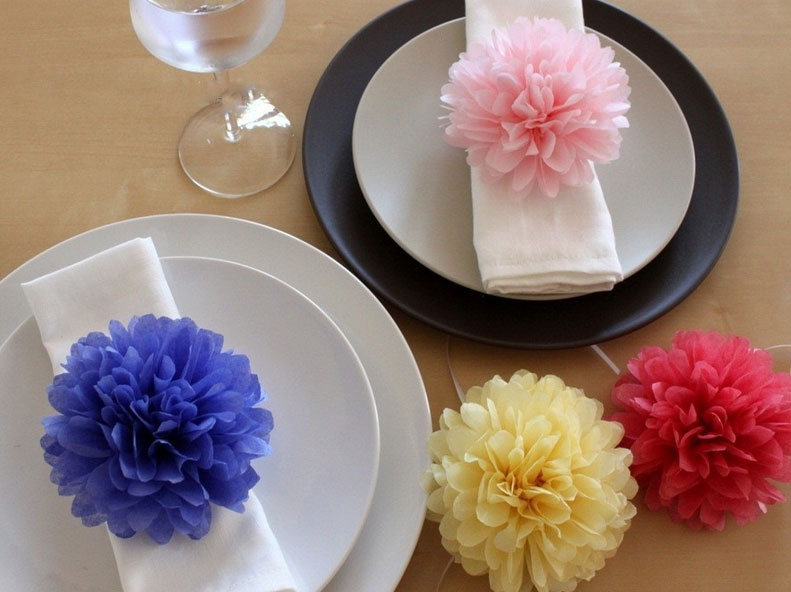 بمساعدة ألوان بسيطة من المناديل الورقية ، والزهور من الورق ، يمكنك تزيين طاولة العطلات بطريقة أصلية.