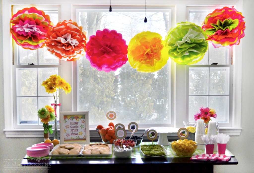- ستكون الغرفة التي تقام فيها عطلة الأطفال أكثر إشراقًا وأنيقًا إذا كانت مزينة بزخارف ملونة من المناديل ، مثبتة على مستويات مختلفة ومزينة بأشرطة ، بما في ذلك الأشرطة الورقية ؛ تحت السقف ، يمكنك "إرسال" بالونات زاهية مضخمة بالهليوم ؛