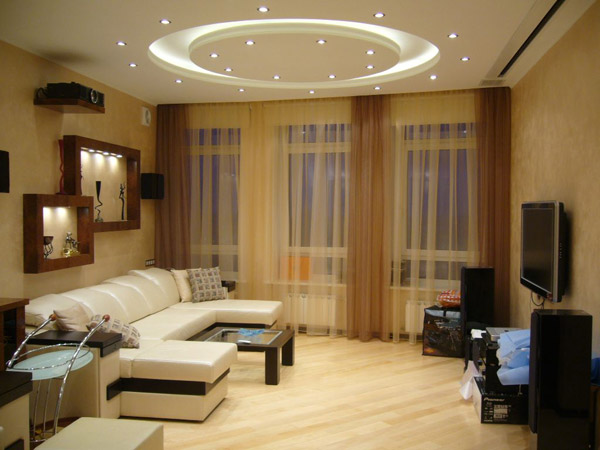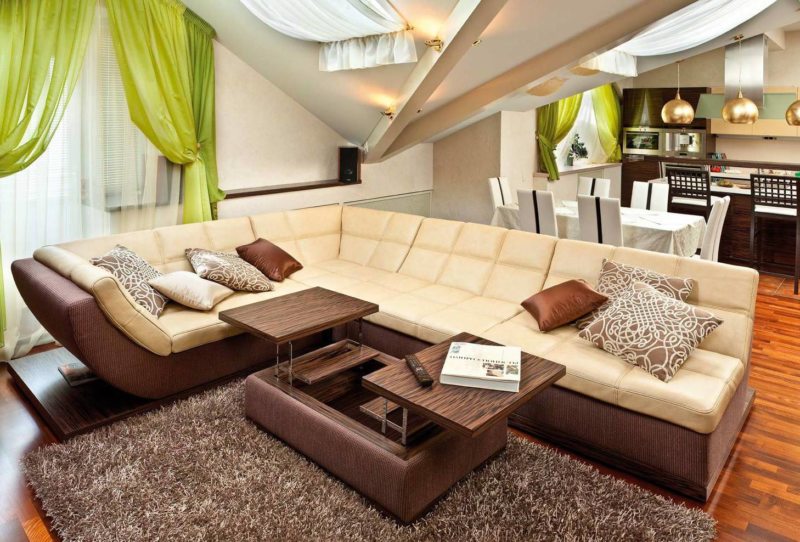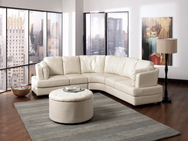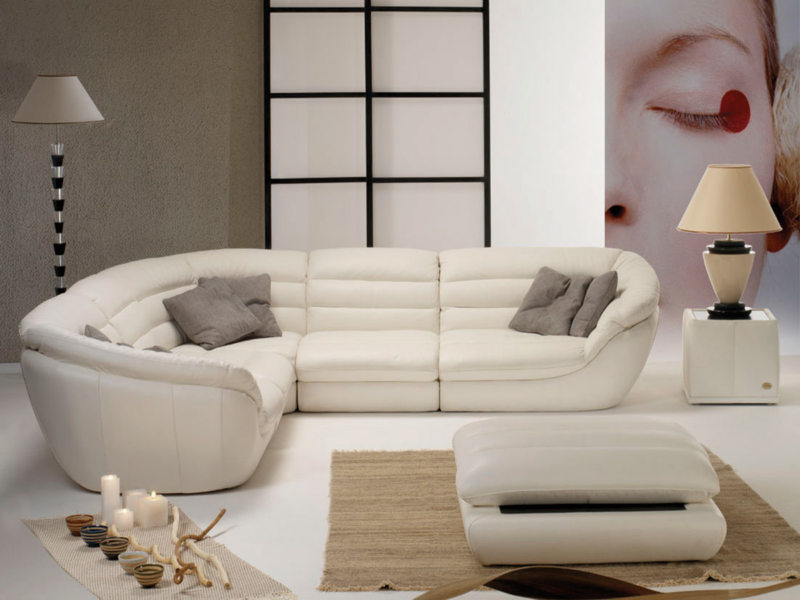 الأرائك الزاوية لها مكافأة إضافية - تتحول بسهولة إلى سرير كبير. خيار مثير للاهتمام يمكن أن يكون أريكة نصف دائرية. إنها تتيح لك استيعاب شركة رائعة بشكل مريح أمام شاشة التلفزيون.