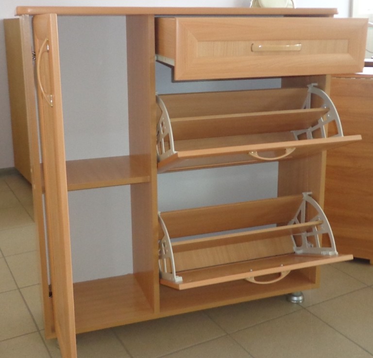 سيؤدي شراء منتج مع أدلة وآلية قابلة للطي إلى تبسيط مهمة تخزين الأحذية في الرواق. شراء الملحقات بشكل منفصل ، سوف تكون قادرة على صنع خزانة ملابس مريحة من اللوح نفسك.