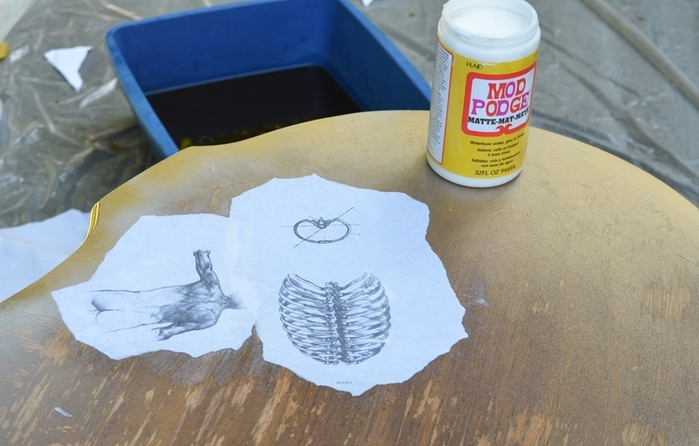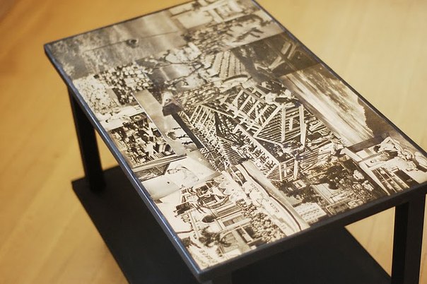 نحن نلصقها بالغراء من الجانب القاسي ونضغطها ونلصقها على السطح. نزيل المخالفات وفقاعات. طلاء الاكريليك الطلاء الأبيض أو الأسود على ملامح الصورة. مع نفس الطلاء من خلال الاستنسل نجعل زوايا الطاولة. بعد كل شيء جاف ، ضع طبقة من الورنيش.