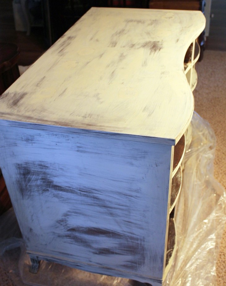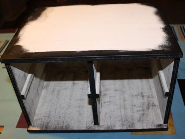 - اسفنجة بالتناوب promakivaem جميع جوانب الأثاث المستخدمة ، مع الأخذ الذهب ، ثم البني ، ثم الطلاء الأسود والأخضر.