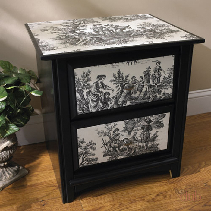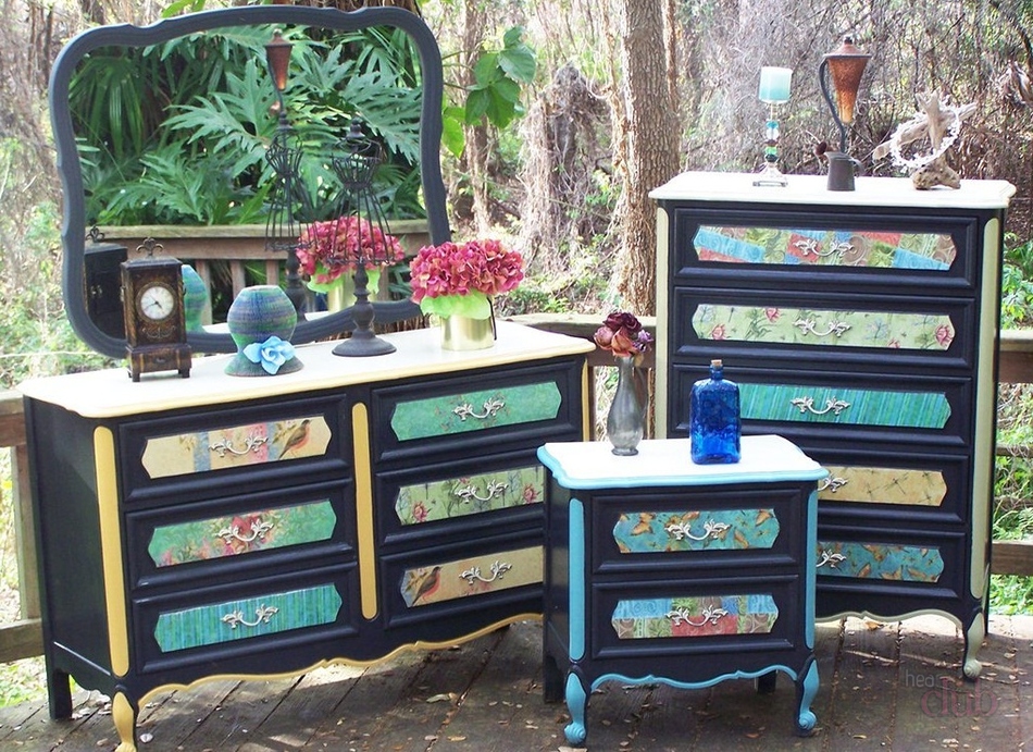 تتيح سهولة التنفيذ حتى للأشخاص الذين ليس لديهم مهارات فنية تحويل أي قطعة أثاث إلى عمل فني. الدانتيل ، والمناديل الورقية ، والأقمشة التي يمكن أن تزين أي سطح ، سواء كان ذلك الخشب أو الزجاج أو البلاستيك ، وتستخدم للزينة. الأكثر شعبية هو decoupage من الأثاث في أسلوب بروفانس. هناك مجالات أخرى: الشبي شيك ، الفيكتوري والعرقي ، والبساطة.