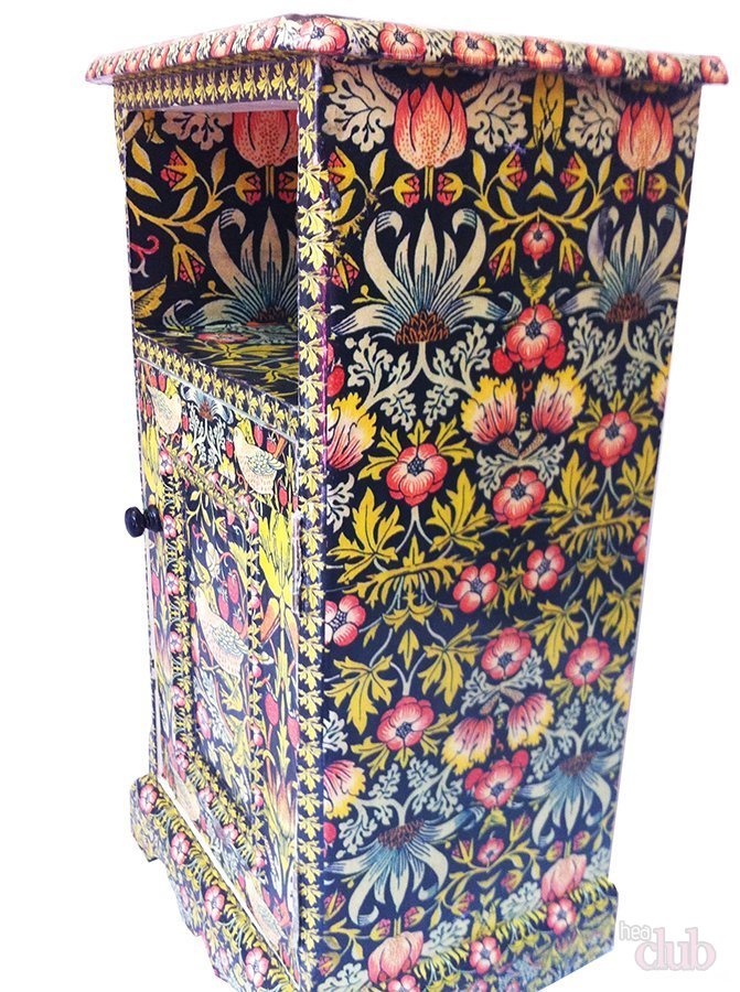 يمكنك أن تأخذ للزينة ليس فقط الصور الورقية ، ولكن أيضا الأقمشة المختلفة. تسمح لك تقنية decoupage هذه بإظهار الخيال. السلبية الوحيدة هي أن الأثاث البلاستيكي غير مناسب للزينة بسبب أسطحه اللامعة. اشتريت المواد اللازمة.خزانات خشبية أرضية ومغطاة بطبقة من التربة. ثم الطلاء على عدة مرات مع الطلاء الاكريليك. قم بتطبيق الرسومات الورقية أو تطبيقات النسيج ، وقم بتغليفها مسبقًا بالغراء الأبيض. بعد أن يجف الغراء ، يمكنك تزيين بالإضافة إلى ذلك بالطلاء والاستنسل لتطبيق الأنماط. المرحلة النهائية ستكون طلاء السطح بالكامل بالورنيش.
