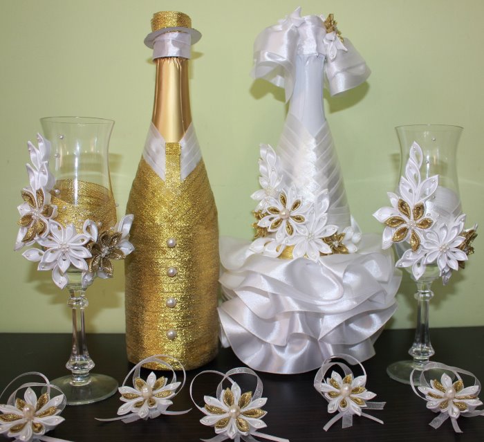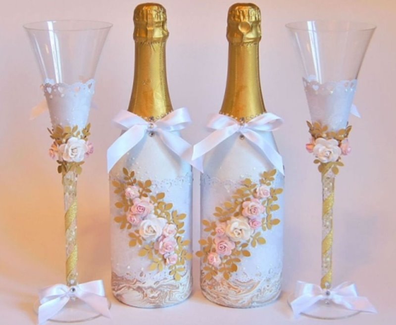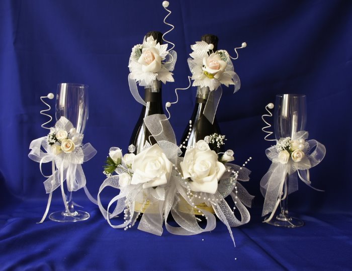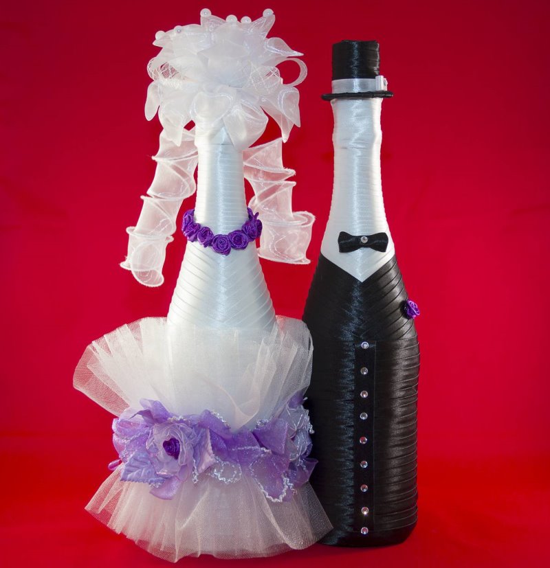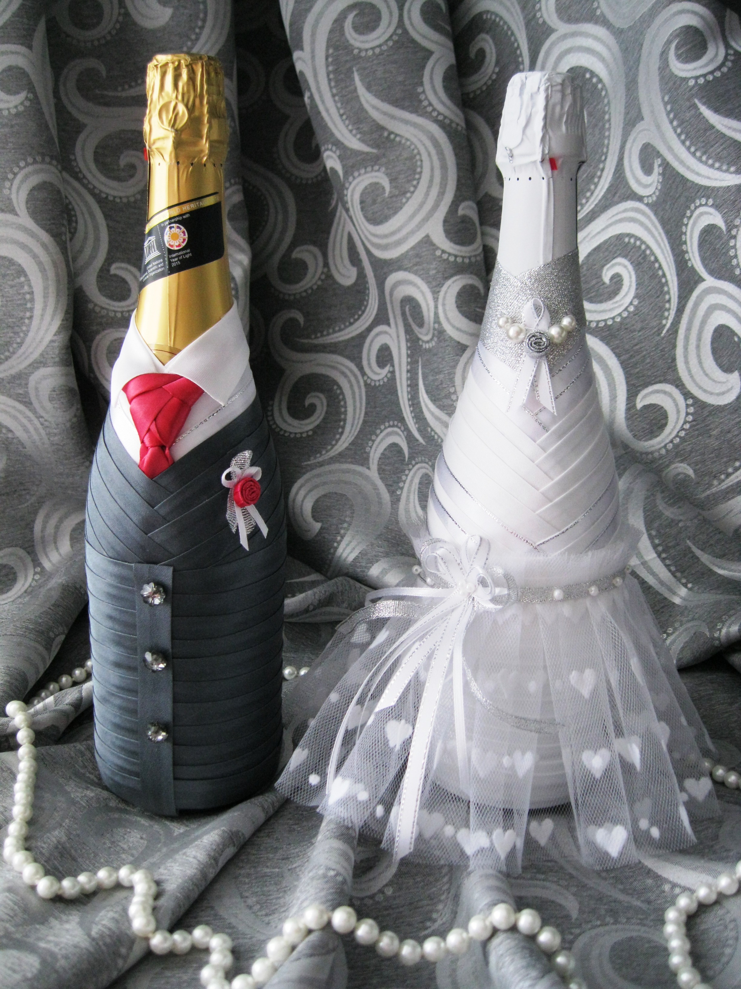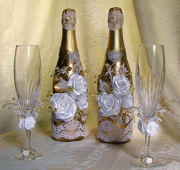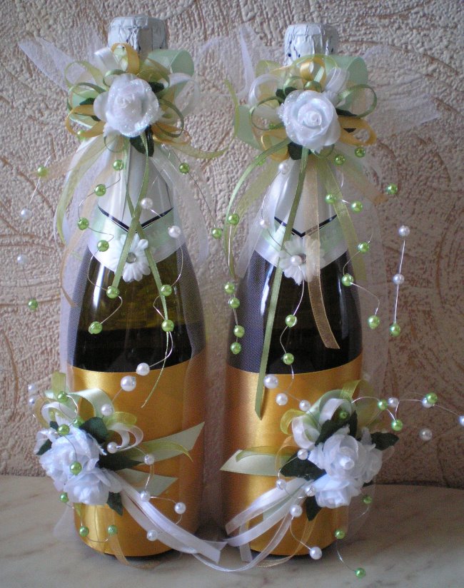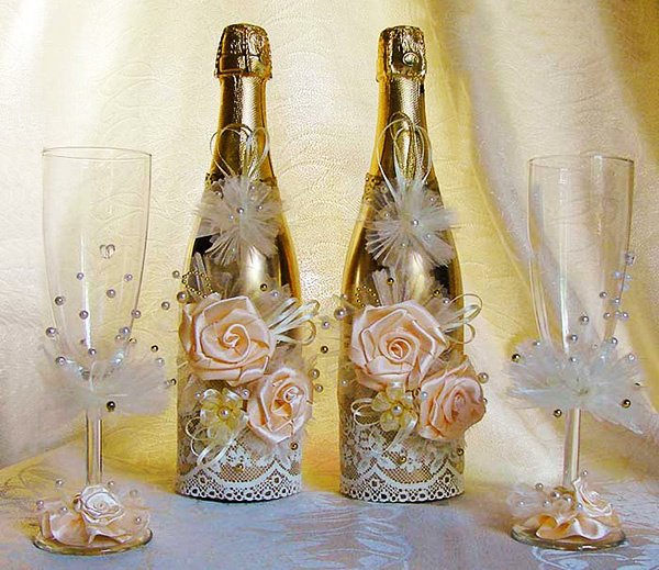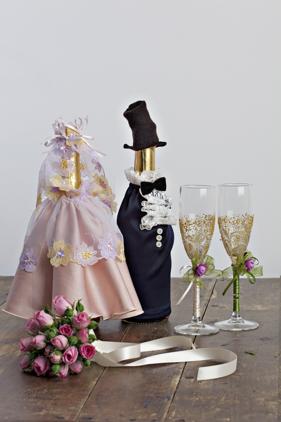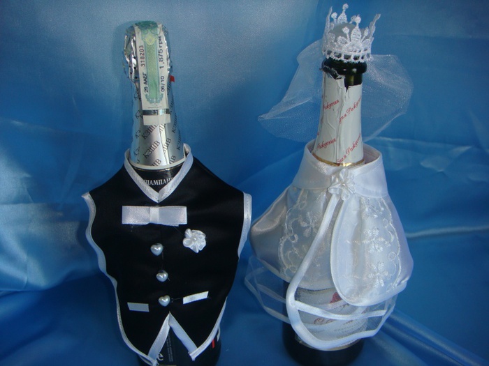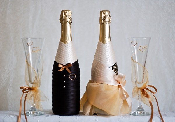 تتميز زجاجات الشمبانيا بحقيقة أنها تكرر عمليا شكل جسم الإنسان. لذلك ، فهي مريحة لاستخدامها لتزيين شخصيات العروس والعريس.