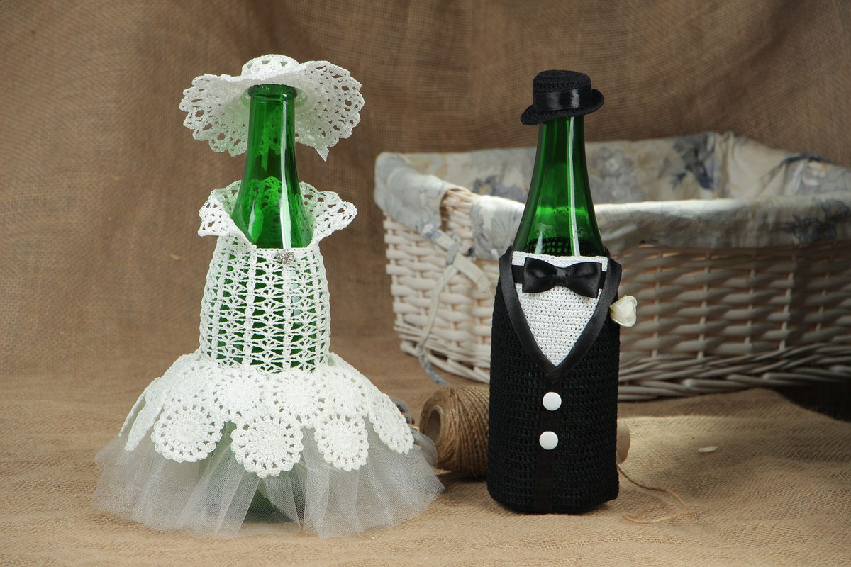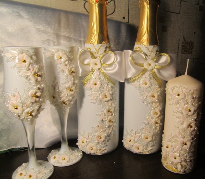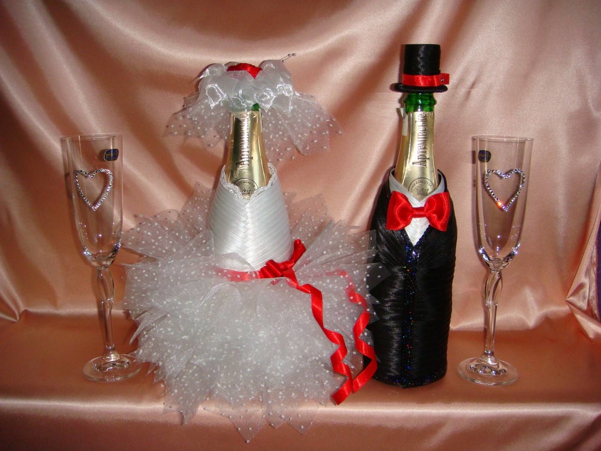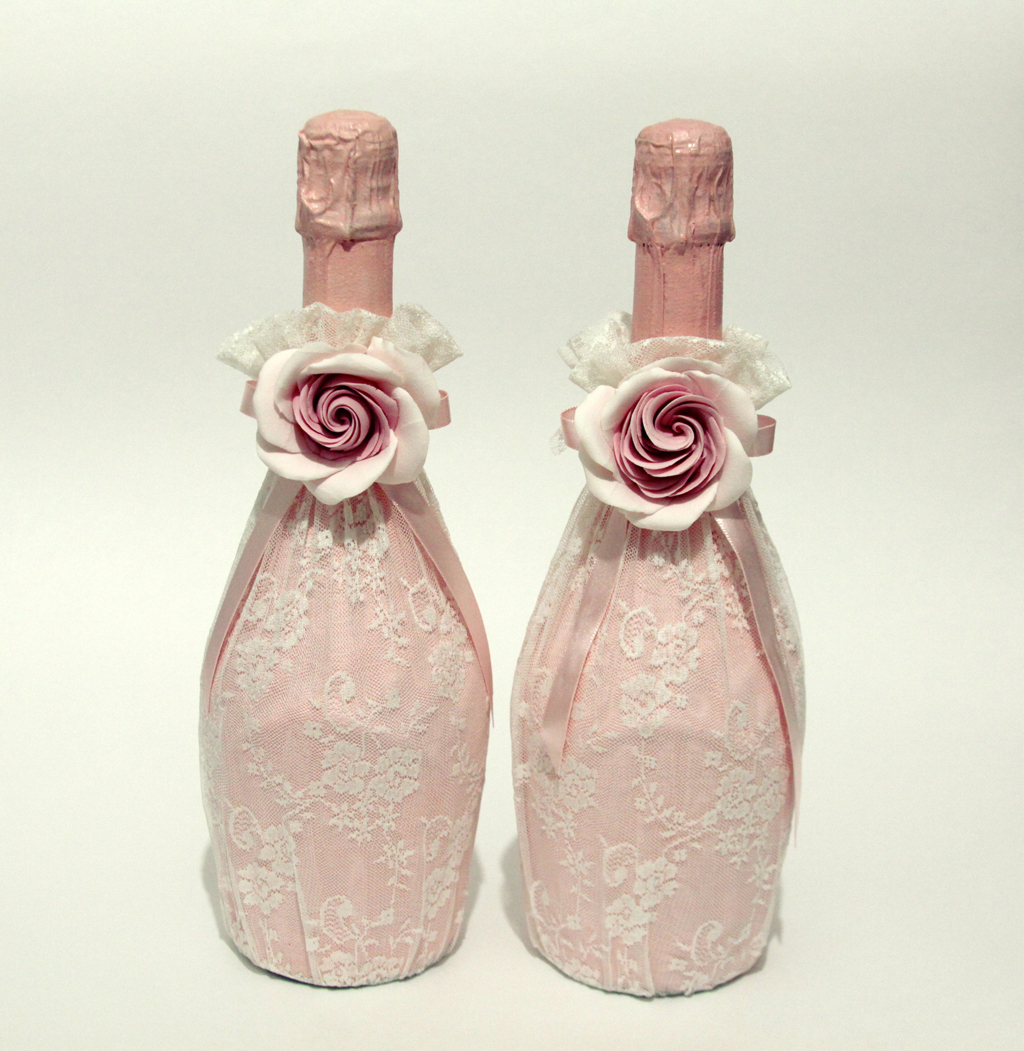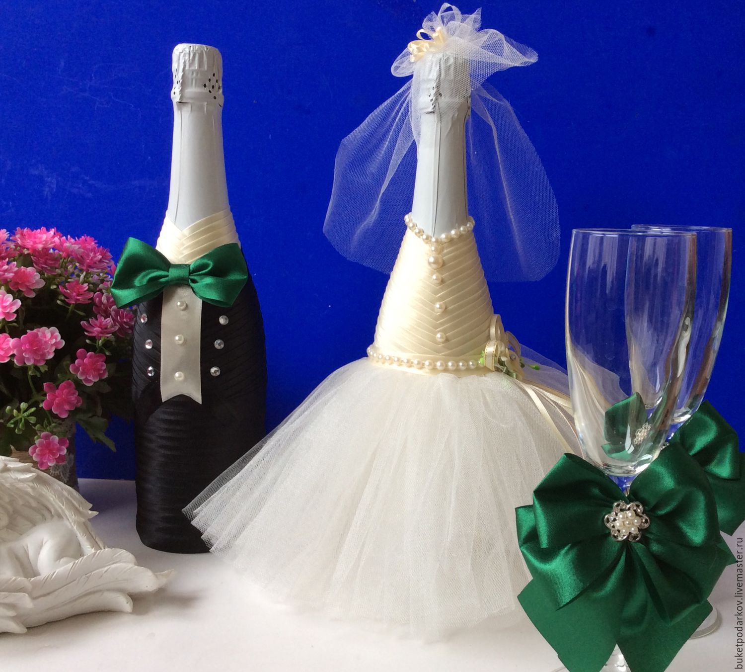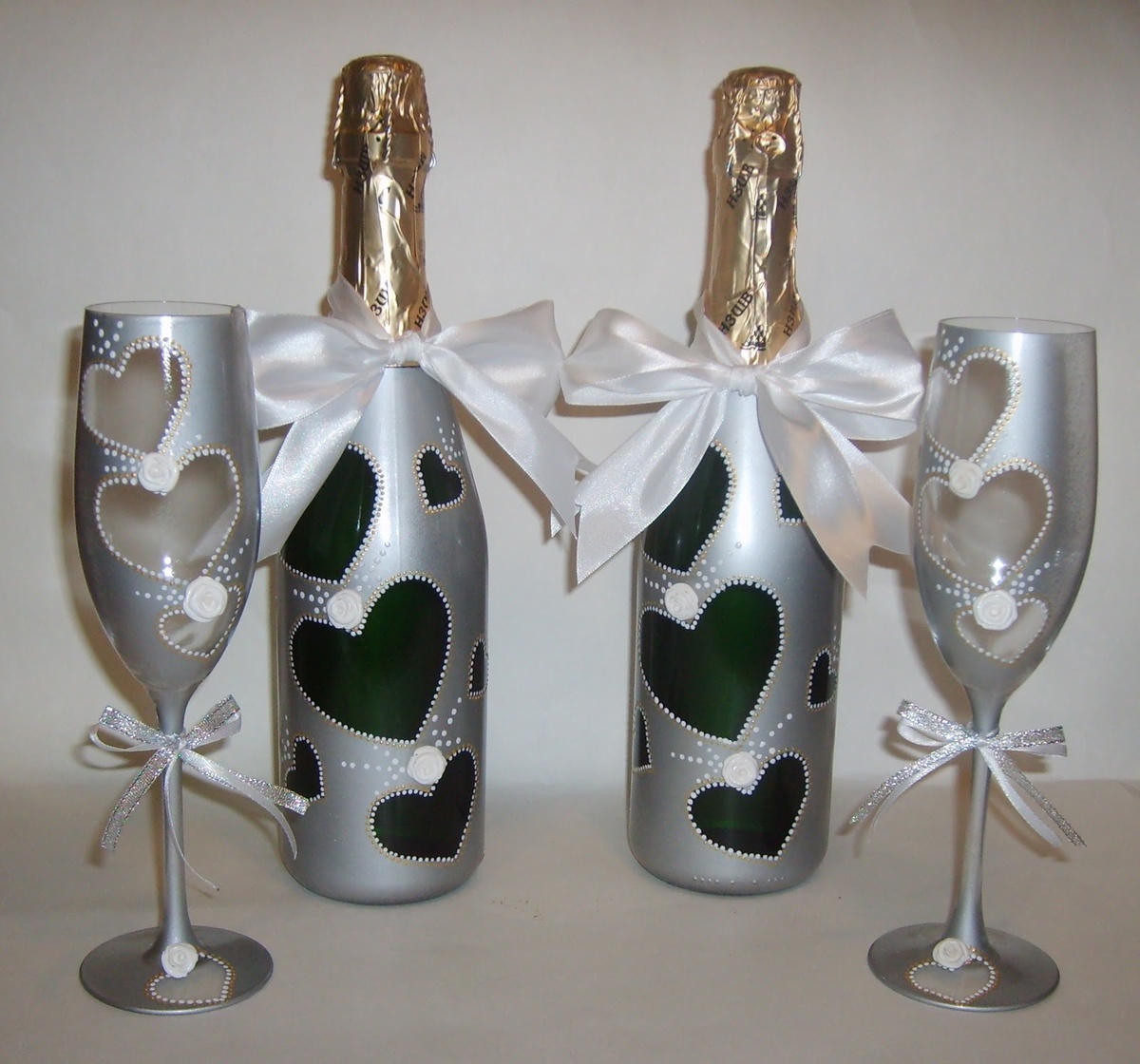 تتميز زجاجات الشمبانيا بحقيقة أنها تكرر عمليا شكل جسم الإنسان. لذلك ، فهي مريحة لاستخدامها لتزيين شخصيات العروس والعريس.