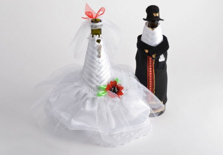 الزجاجة للعروس مصنوعة من شرائط بيضاء. تتم عملية التسجيل على الخطوات المذكورة أعلاه. يتم لصق الغطاء بقطعة صغيرة من الدانتيل ، وهو حجاب. في الحزام يمكن إضافة القوس ، والزهور من شرائط. تزيين الرقبة مع الخرز أو أحجار الراين.