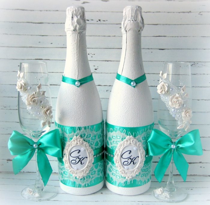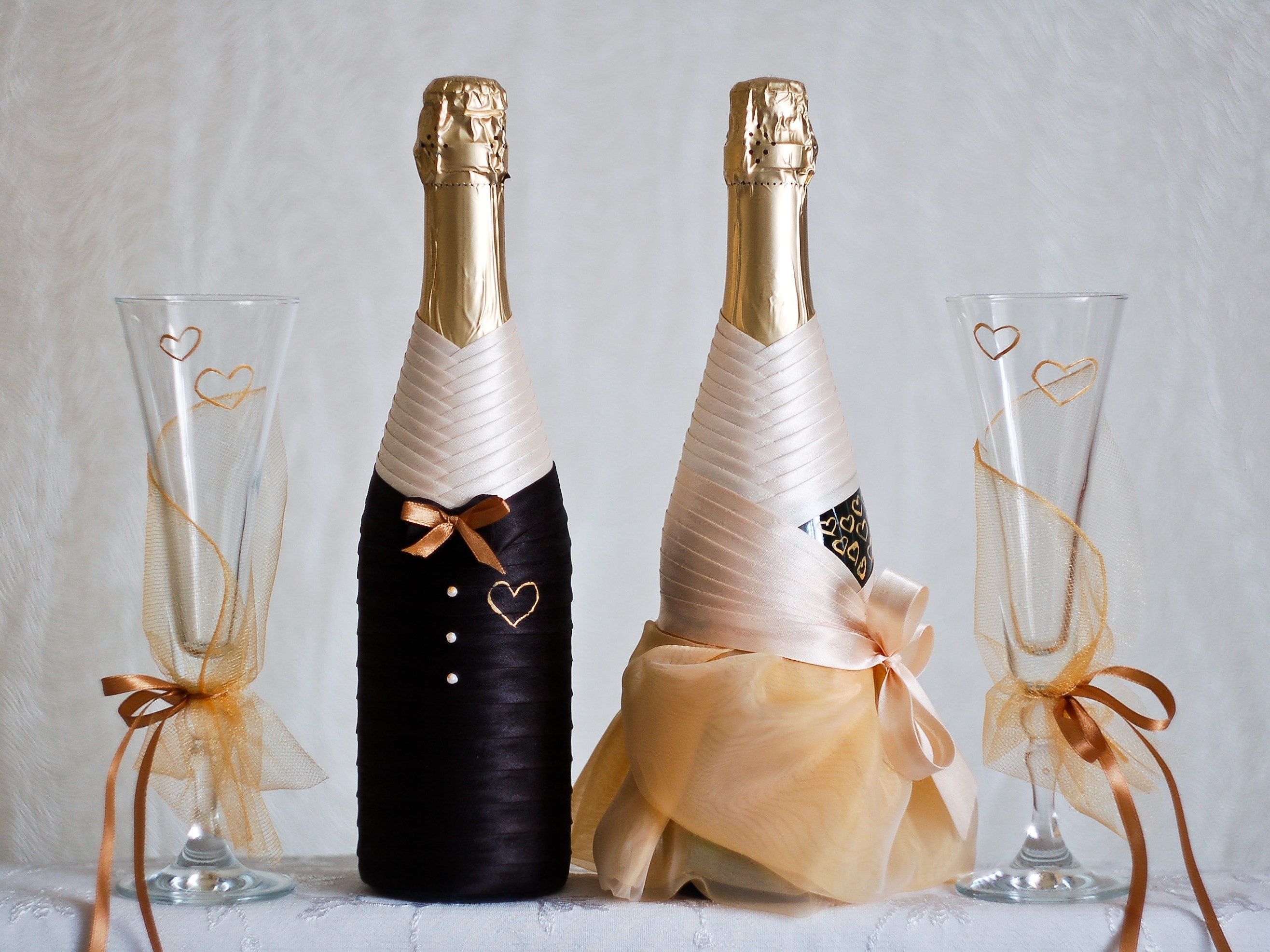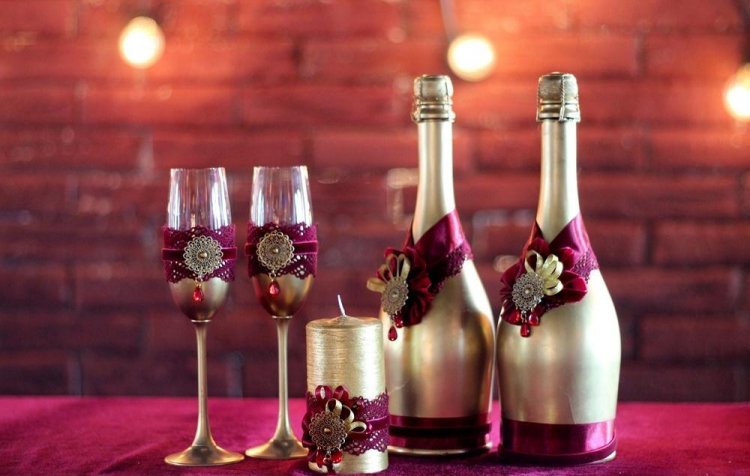 الشمبانيا هو المشروب الرئيسي في كل حفل زفاف. يجب تزيين الزجاجات وتزيينها وفقًا للتصميم الكلي للقاعة الاحتفالية. 8 طرق لمساعدة المتزوجين حديثا في زخرفة زجاجات العطلات.