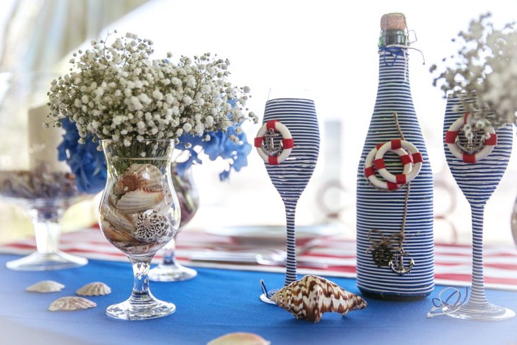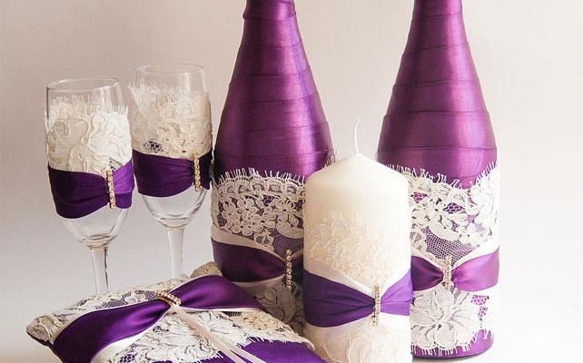 يمكن إنشاء الكثير من الديكور باليد ، بما في ذلك التصميم الأصلي للزجاجات لحفل الزفاف.