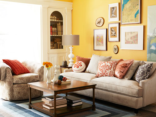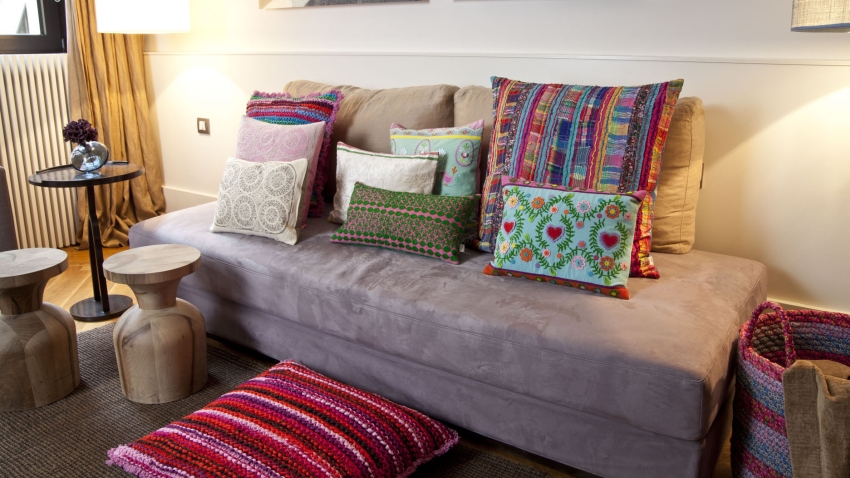 - إذا كان مقياس ألوان الأريكة رتيباً وهادئاً ومكتوماً ، فيمكن تلوينه بأغطية ساطعة من شأنها أن تنعش الجزء الداخلي ، مما يخلق حالة مزاجية سعيدة.