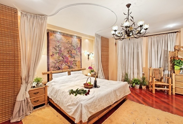 الخشب والحجر الطبيعي - المواد الطبيعية الأكثر شيوعا للتسجيل. ومع ذلك ، يمكن تزيين المساحة بالنباتات. باستخدام الأواني المعلقة الأصلية والمنافذ والبذور النضرة ، يمكنك تصميم فريد من نوعه في غرفة النوم.