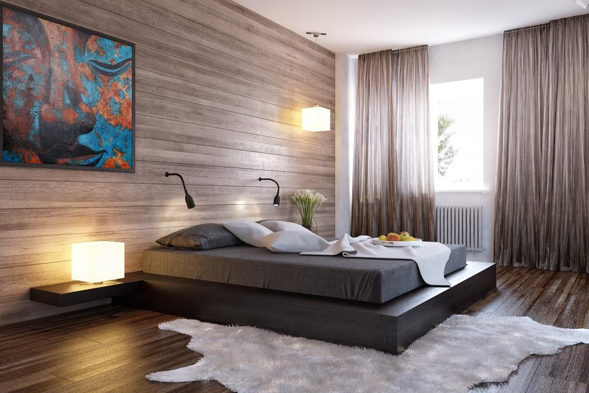 يمكن أن يكون أرفف ، منافذ ، لوحات ، إطارات خشبية للمرايا. يمكنك جعل جانب واحد تماما من الخشب. سيخلق عالماً منفصلاً على النقيض من بقية المساحة ، وفصل المنطقة بسرير عن بقية الغرفة ، وخلق جو دافئ ومريح.