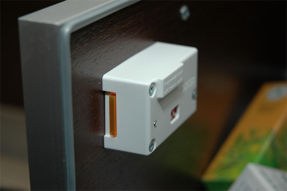 يفتح الجهاز بمساعدة زر مخفي. لا يلزم لصقها على الجدران ، حيث يتم تثبيت هذا القصاص على المقبض. يحدث القفل تلقائيًا عند إغلاق الباب بالكامل.