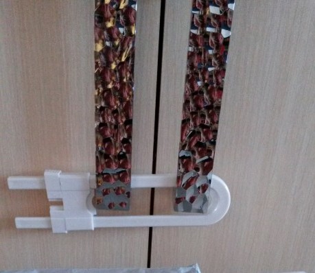 - بطبيعة الحال ، إذا لم يكن من الممكن شراء أدوات خاصة ، فإن على الأشخاص التعامل مع المواد الخردة. ترتبط مقابض الخزانات بحبال أو أشرطة مطاطية فيما بينها. يتم تأمين الأدراج القابلة للسحب بشريط لاصق أو فيلكرو. في الخزانة ذات باب جرار ، يمكنك "إسفين" العجلة ، مما يساعدها على الفتح والإغلاق. ومع ذلك ، مع وجود مثل هذه الأساليب ، هناك الكثير من الإزعاج: يجب أن تكون الحبال غير مقيدة في كل مرة ، ويقوم الشريط اللاصق بإصلاح الأبواب بطريقة غير موثوقة ، ومن الصعب غسلها من الأثاث. تبدأ هذه الأساليب في النهاية في الاستسلام لأيادي الأطفال ولا فائدة منها. بالنسبة للأطفال النشطين بشكل خاص ، لا يمثلون مشكلة على الإطلاق. في كثير من الأحيان ، يتعين على والدي هذا الطفل تحريك جميع الخزائن وخزائن الملابس في المنزل مقابل بعضهم البعض أو ضد الحائط. تخيل مدى صعوبة أخذ شيء للبالغين من هناك.