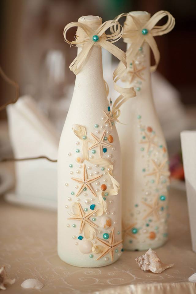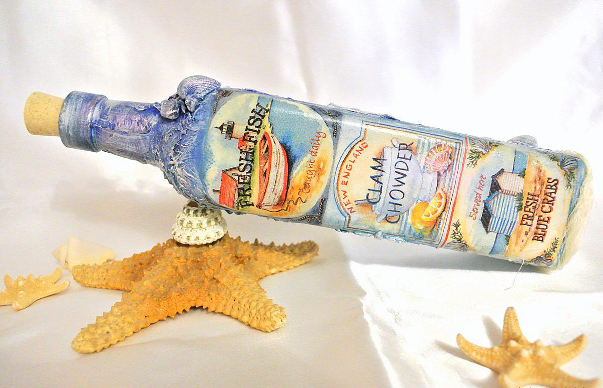 ينطوي زخرفة الزجاجات والمزهريات بطرق ومواد مختلفة على استخدام المواد الطبيعية مثل الأصداف. أساسا ، يتم استخدام هذه التقنية في النمط البحري. لإنشاء مثل هذه الزخرفة ، يتم إزالة الشحوم من السطح ويطبق عليه الغراء. أولاً ، قم بتزيين الحاوية بخيوط ، ثم يتم لصقها على الأصداف والعناصر البحرية الأخرى.