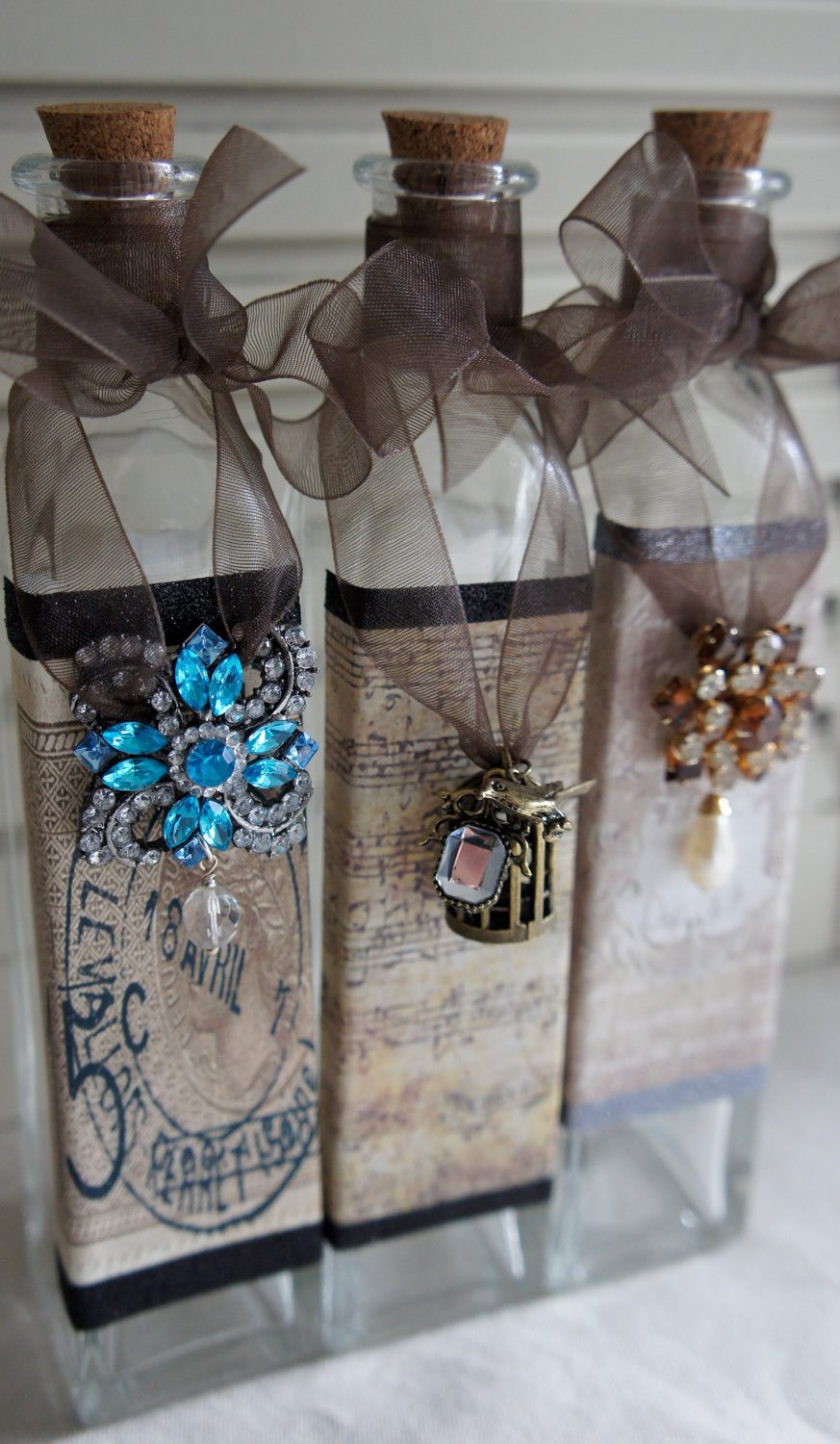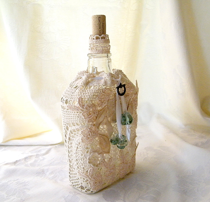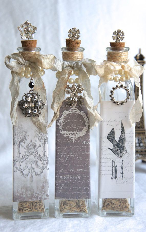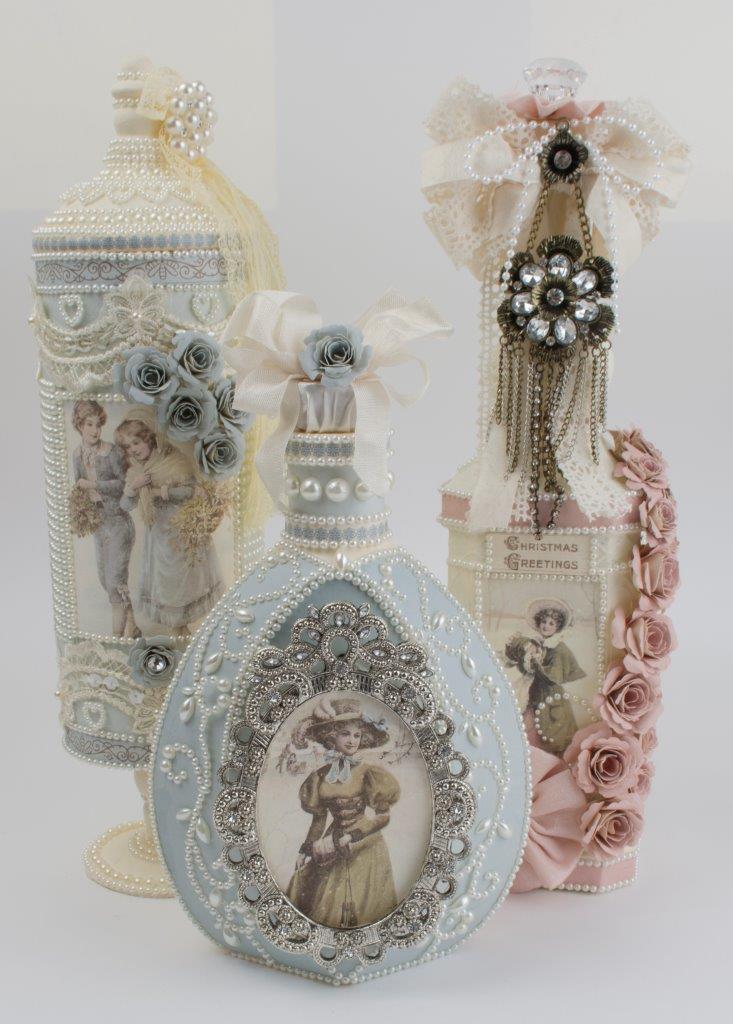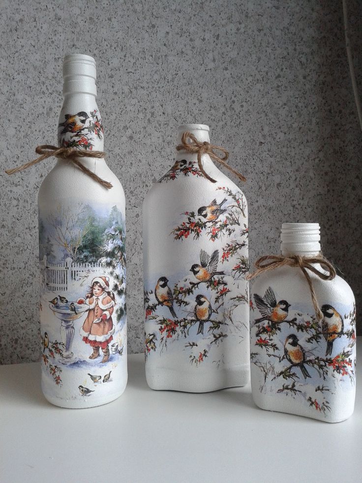 زجاجات خمر حساسة في تقنية decoupage مع ديكور من مواد مختلفة.