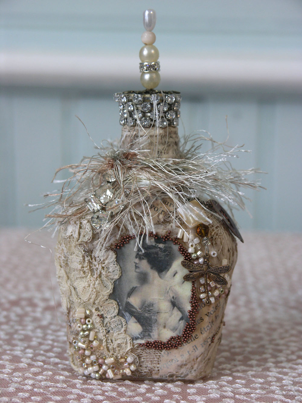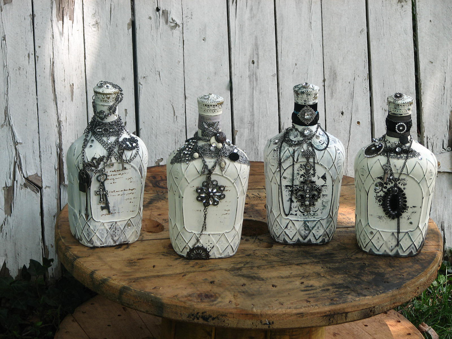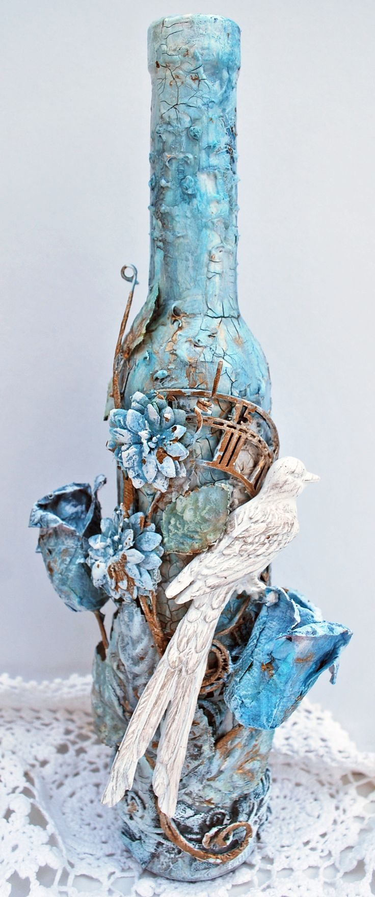 زجاجات خمر حساسة في تقنية decoupage مع ديكور من مواد مختلفة.