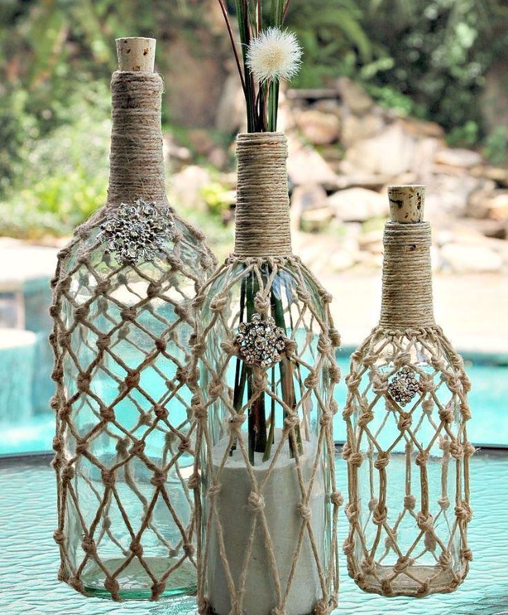 يتم إزالة الشحوم من السطح بعناية ، ثم تأخذ قطعة من البرمة وتبدأ في لفها على قاعدة الزجاجة. لتحسين عقبة استخدام الغراء. وهكذا يتم جرح خيوط من أسفل إلى أعلى ، مع إصلاح النهاية بالغراء. ثم يمكنك تزيين الزجاجة بأزهار أو أزرار أو شرائط أو خرز.