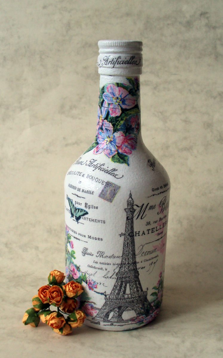 لتزيين الزجاجات بأيديهم في المنزل ، اختر أسلوب فك الشفط في أغلب الأحيان. للقيام بذلك ، اختر وعاءًا ذو سطح أملس ، وقم بتقليله بعناية ووضع التربة. تستخدم المناديل المزخرفة بزينة الزجاجة بأيديهم ، إذا كانت تحتوي على 3 طبقات ، فإنهم يأخذون فقط الطبقة العليا ، التي يرسم عليها الرسم.