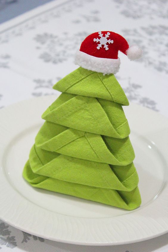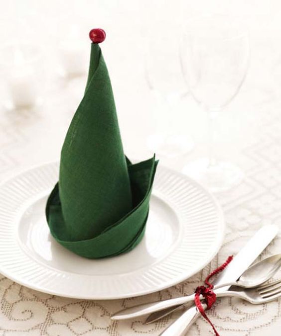 لتزيين جدول السنة الجديدة ، نقدم لك طي المناديل على شكل أشجار عيد الميلاد.