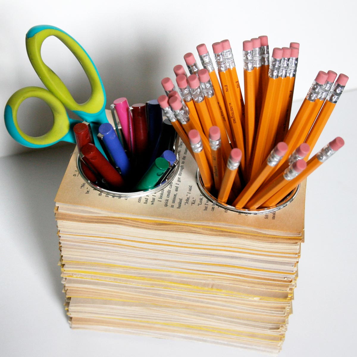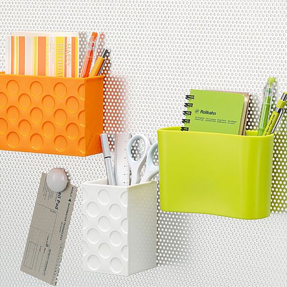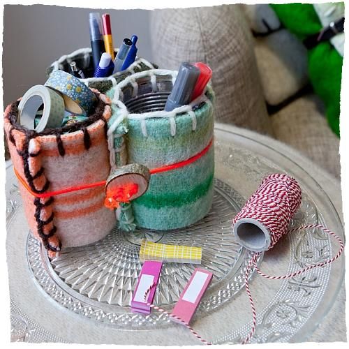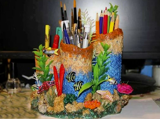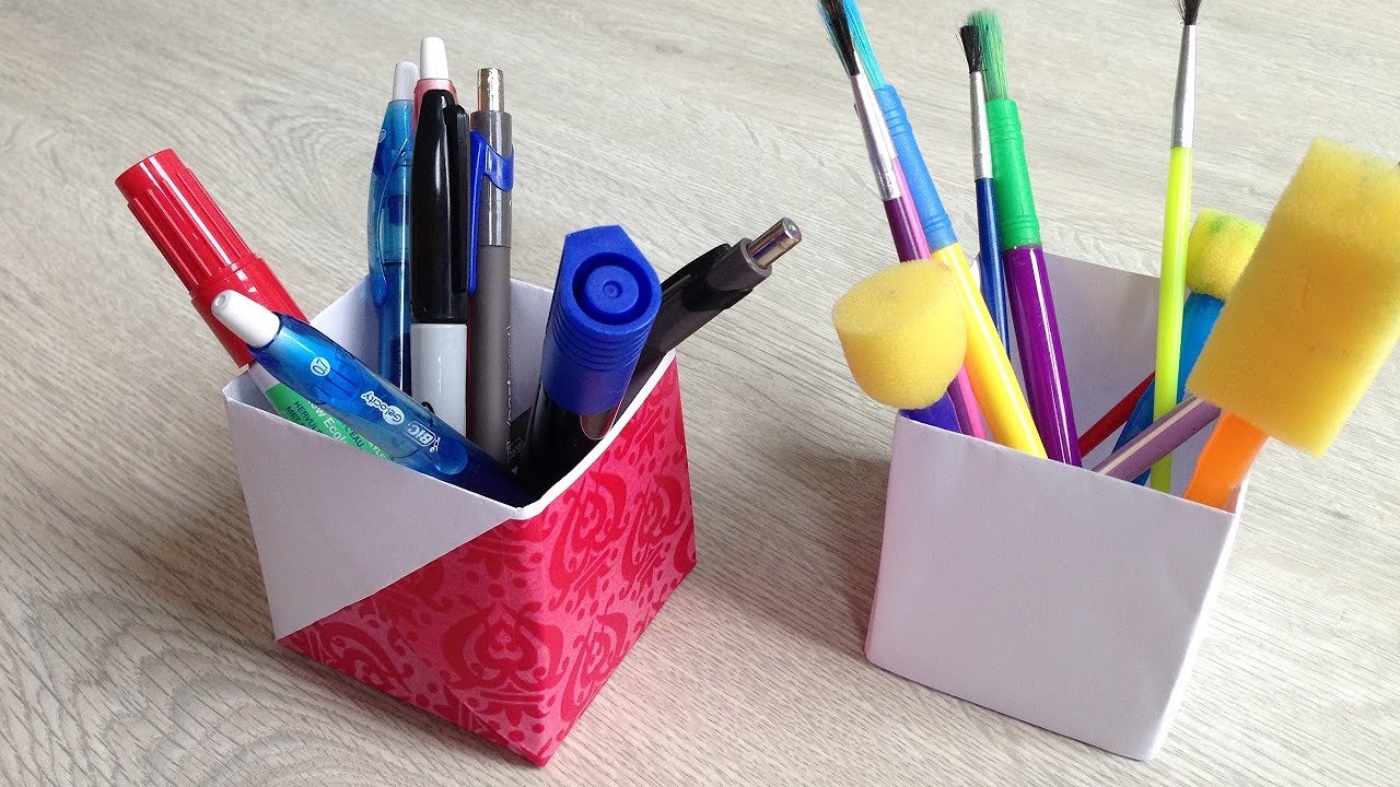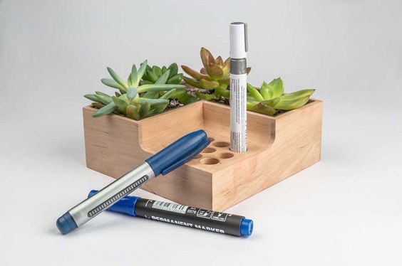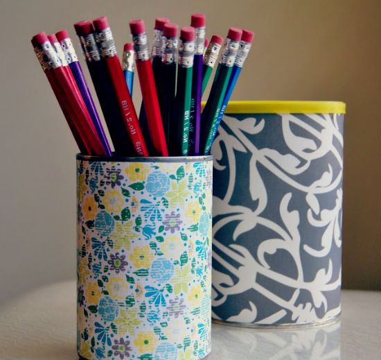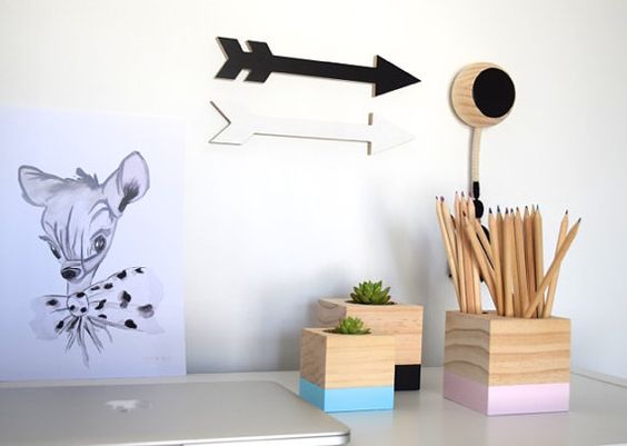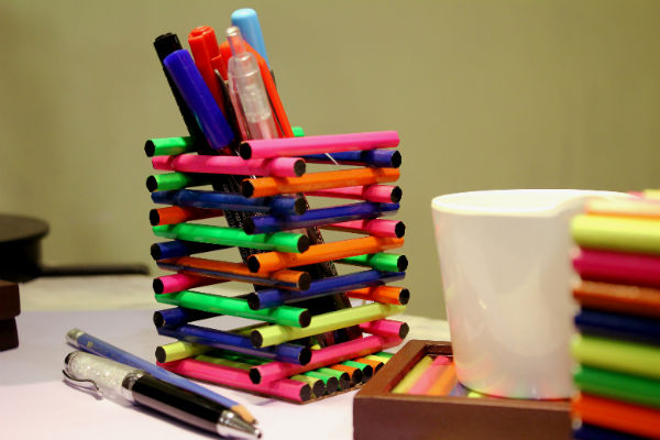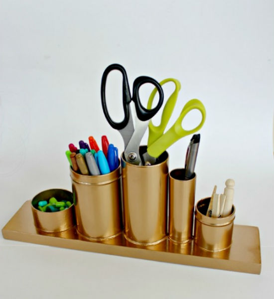 للحفاظ على النظام على سطح مكتبك المنزلي ، يمكنك إنشاء منصات لأقلام الرصاص والأقلام والمقص واللوازم المكتبية الأخرى.