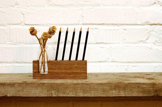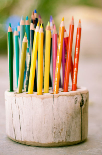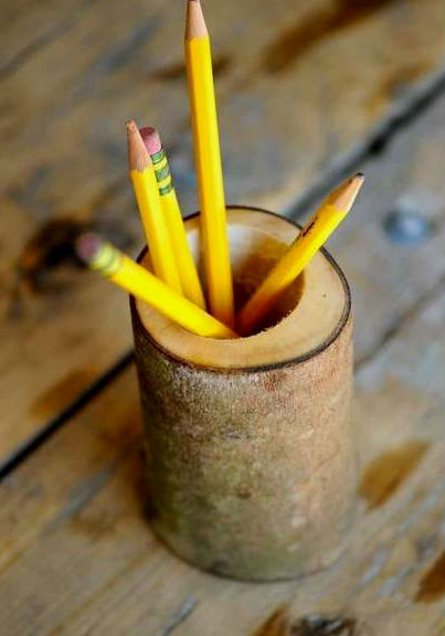 من السهل إنشاء حامل للأقلام من قضيب خشبي: تحتاج إلى حفر ثقوب في فراغ بالحجم المناسب وبالكمية المناسبة.