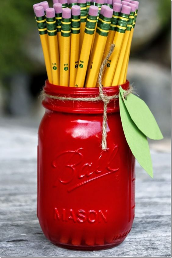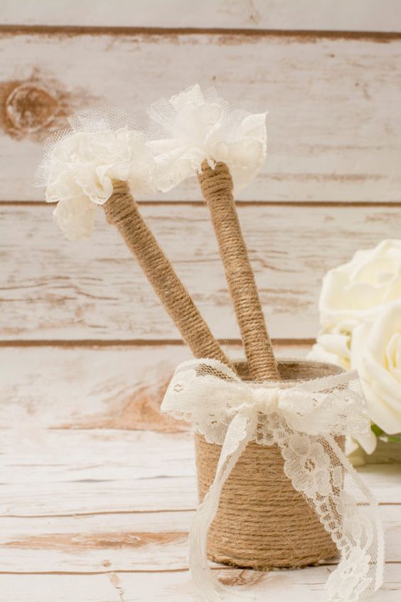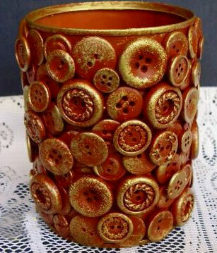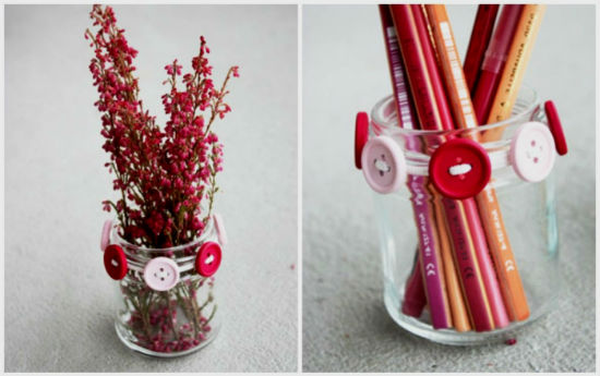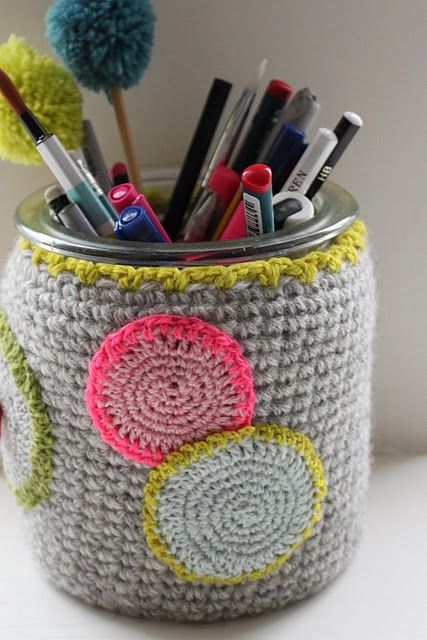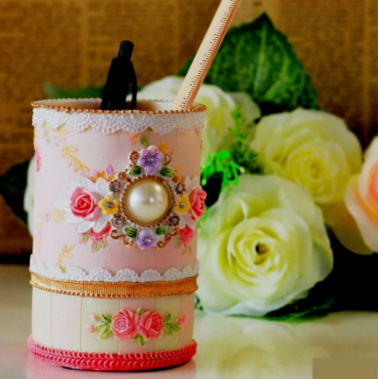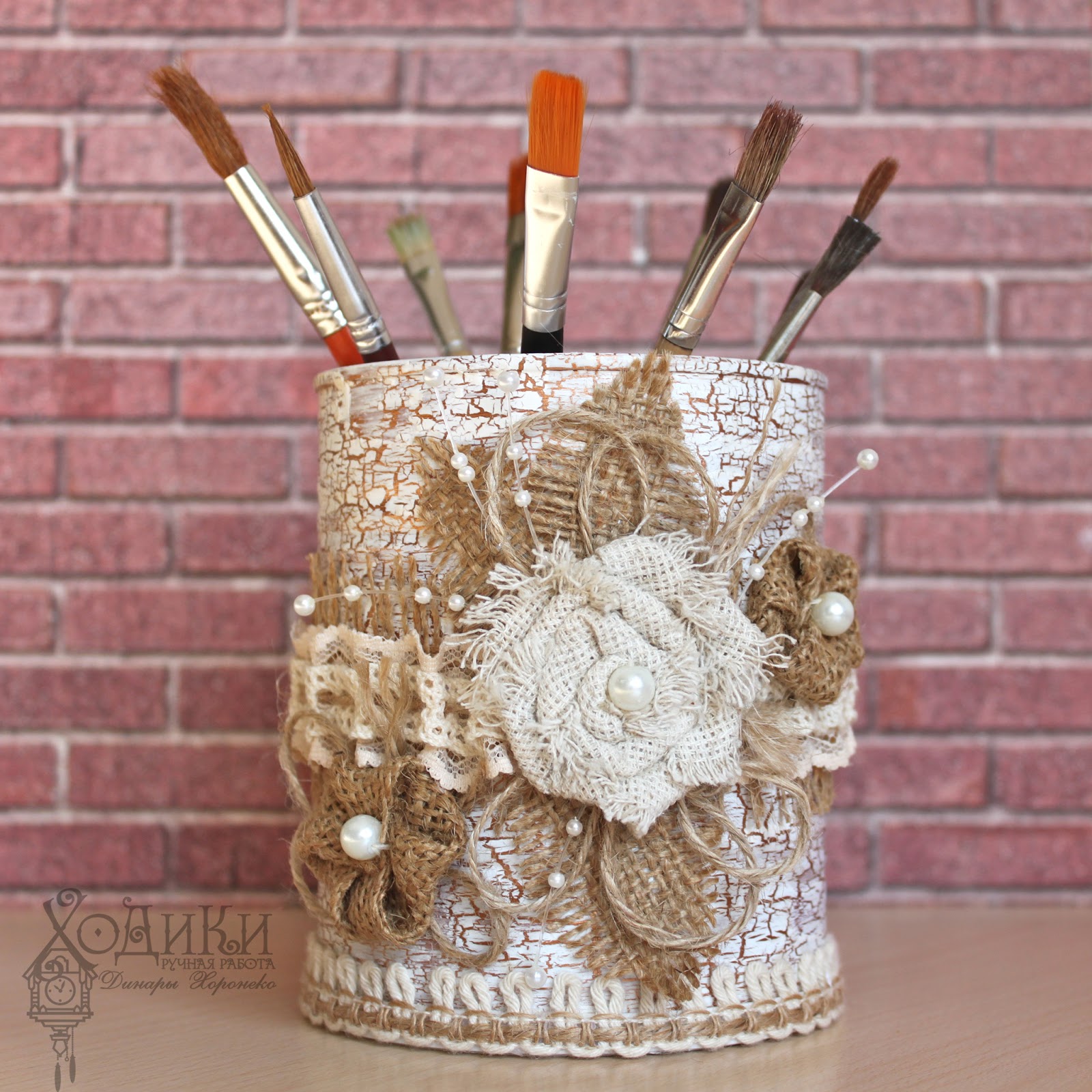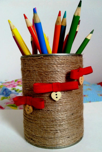 تقف للأقلام تفعل ذلك بنفسك من علب الصفيح والخيوط والعناصر الزخرفية والخيال. جرة عادية مغطاة بطبقة من الغراء وملفوفة بخيط (إما من نفس اللون أو متعدد الألوان).