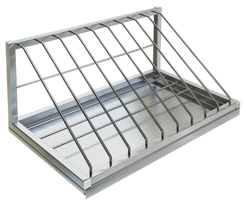 بدلاً من ذلك ، يمكنك استخدام مجففات صغيرة من طابق واحد للألواح. هذا التصميم مفيد أيضًا عند ترتيب الخزانة الرئيسية لتجفيف الأطباق والأقداح. يمكن وضع الحامل على نفس الجرف مع الأرضيات الرئيسية لغرفة التجفيف.