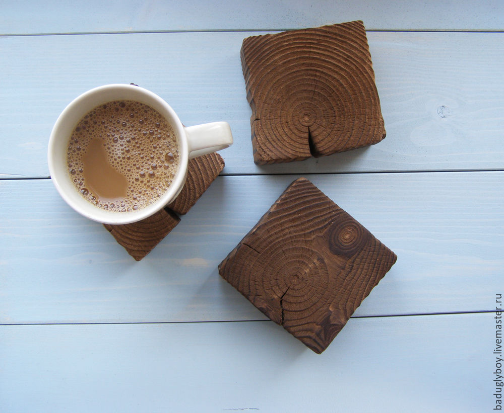 الصباح هو الأفضل أن تبدأ بابتسامة. جعل قاعدة من الورق المقوى السميك أو الخشب الرقائقي.مشاهد الغراء مضحك ، zakalete في عدة طبقات. وضعت على مشروب ساخن ونفرح.